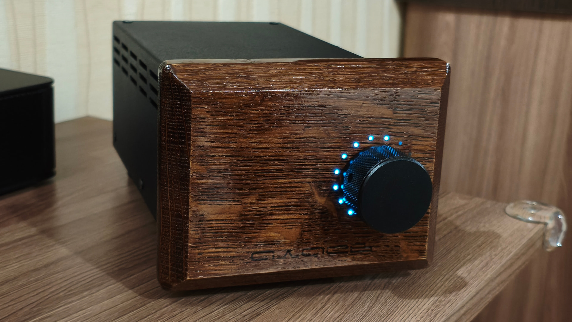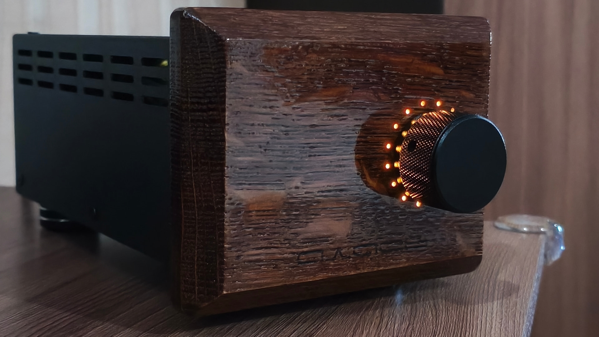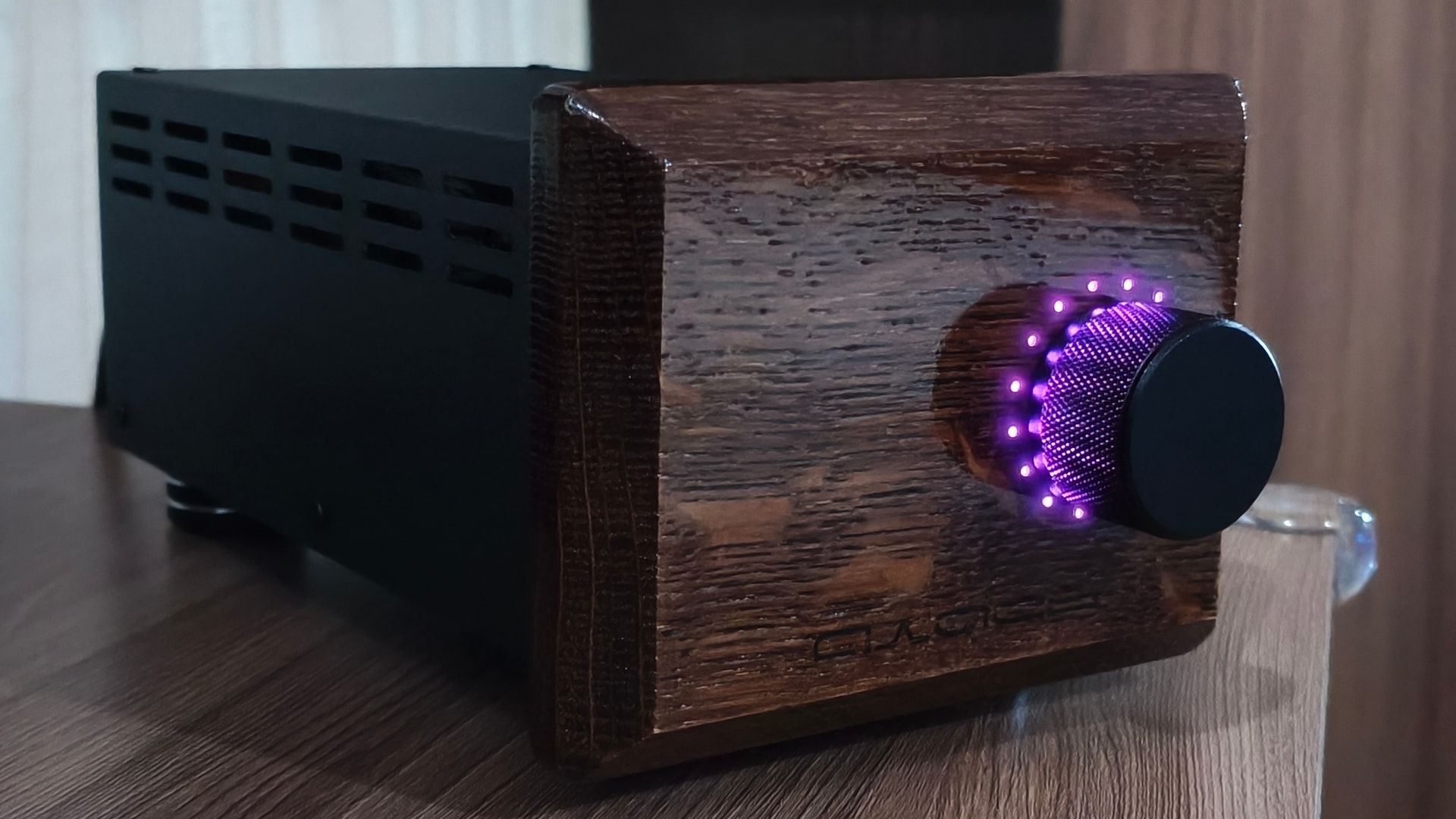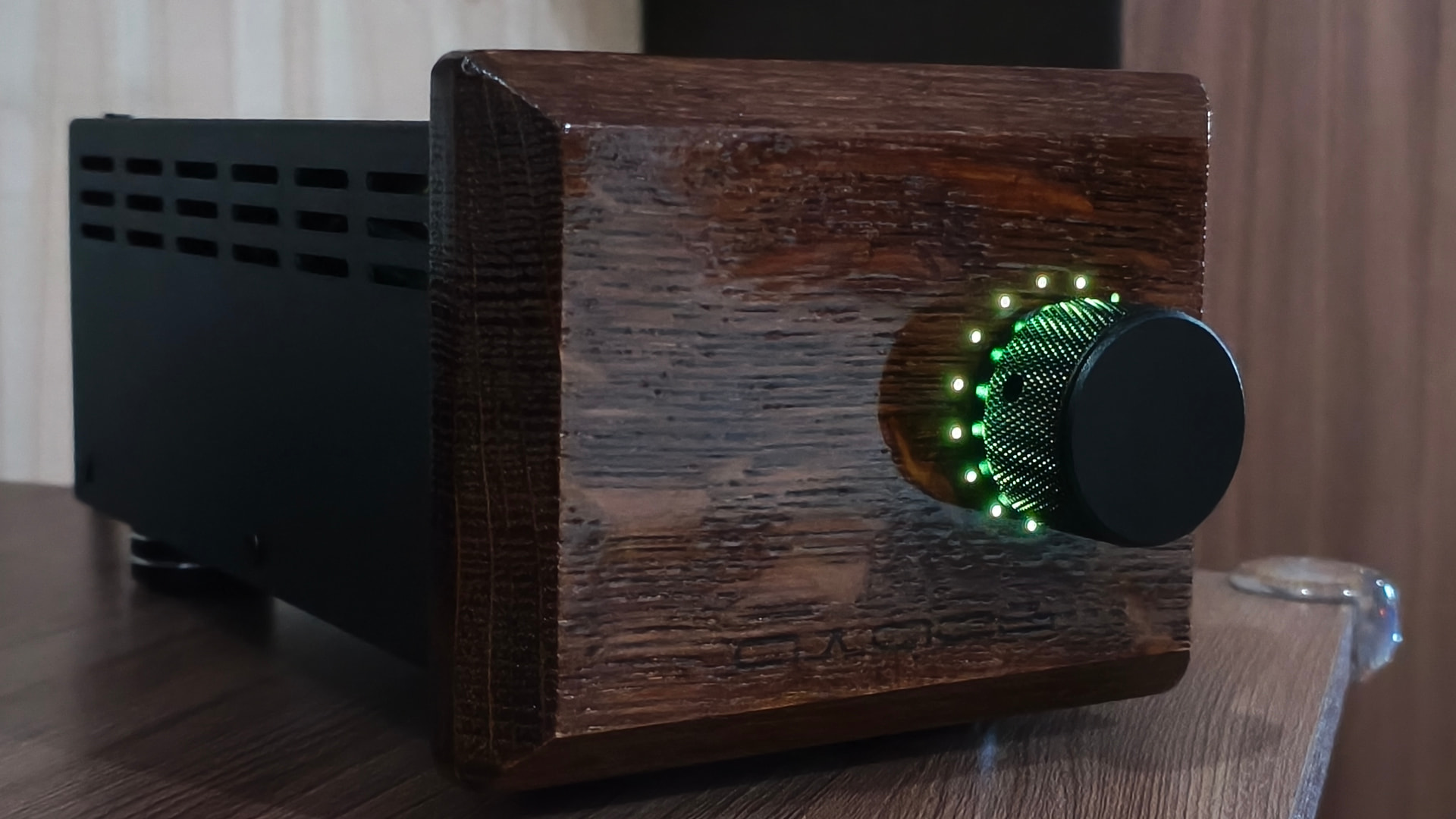 На мой вкус прослеживается явный перебор с выводимой на обозрение пользователя информацией и мне захотелось сделать подобное устройство более сдержанным во внешнем оформлении. В новой версии сборки я решил отказаться от ЖК-индикатора, а круговую светодиодную шкалу спрятать за декоративной деревянной фальшпанелью, выполненной из массива дуба.