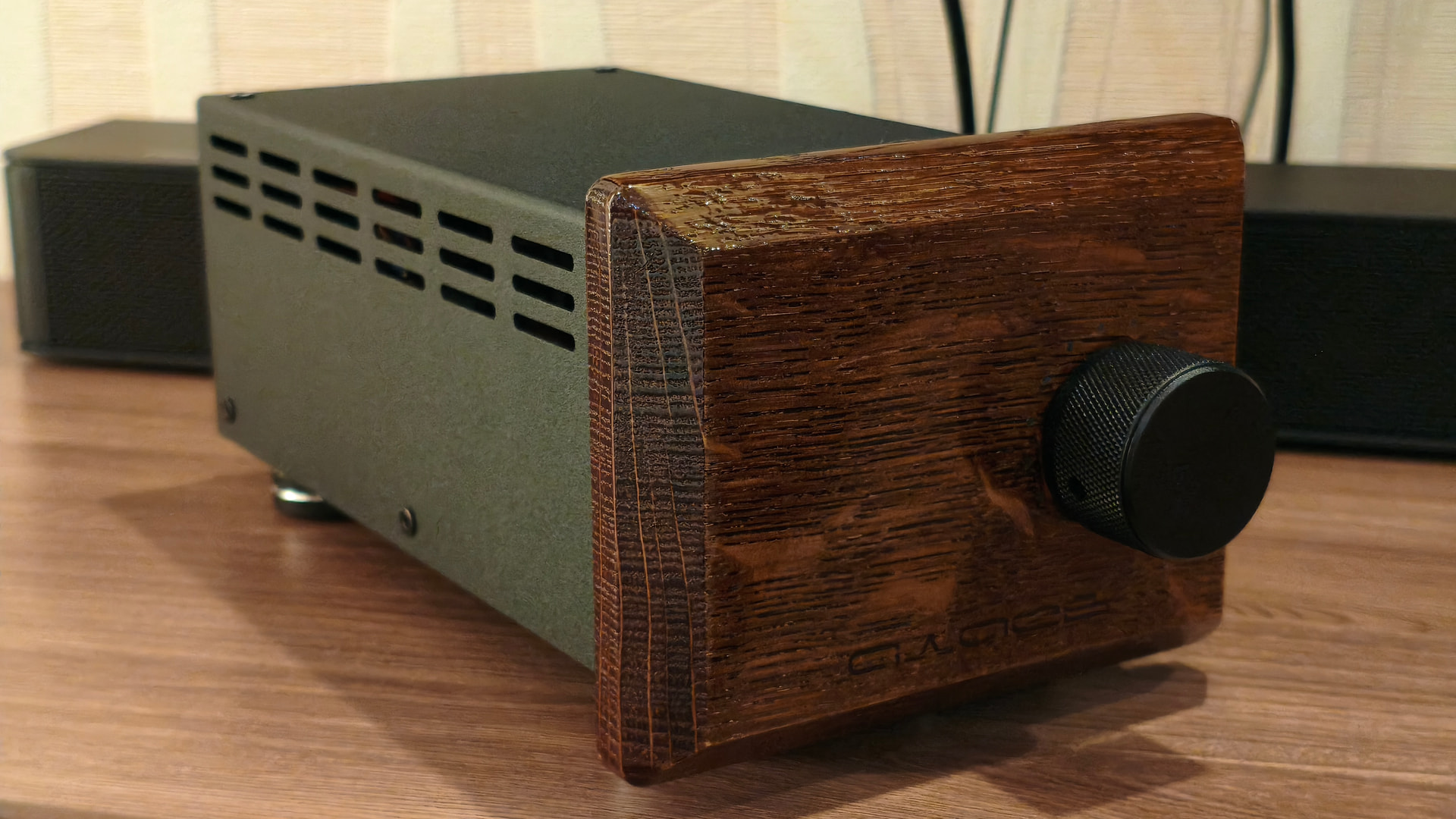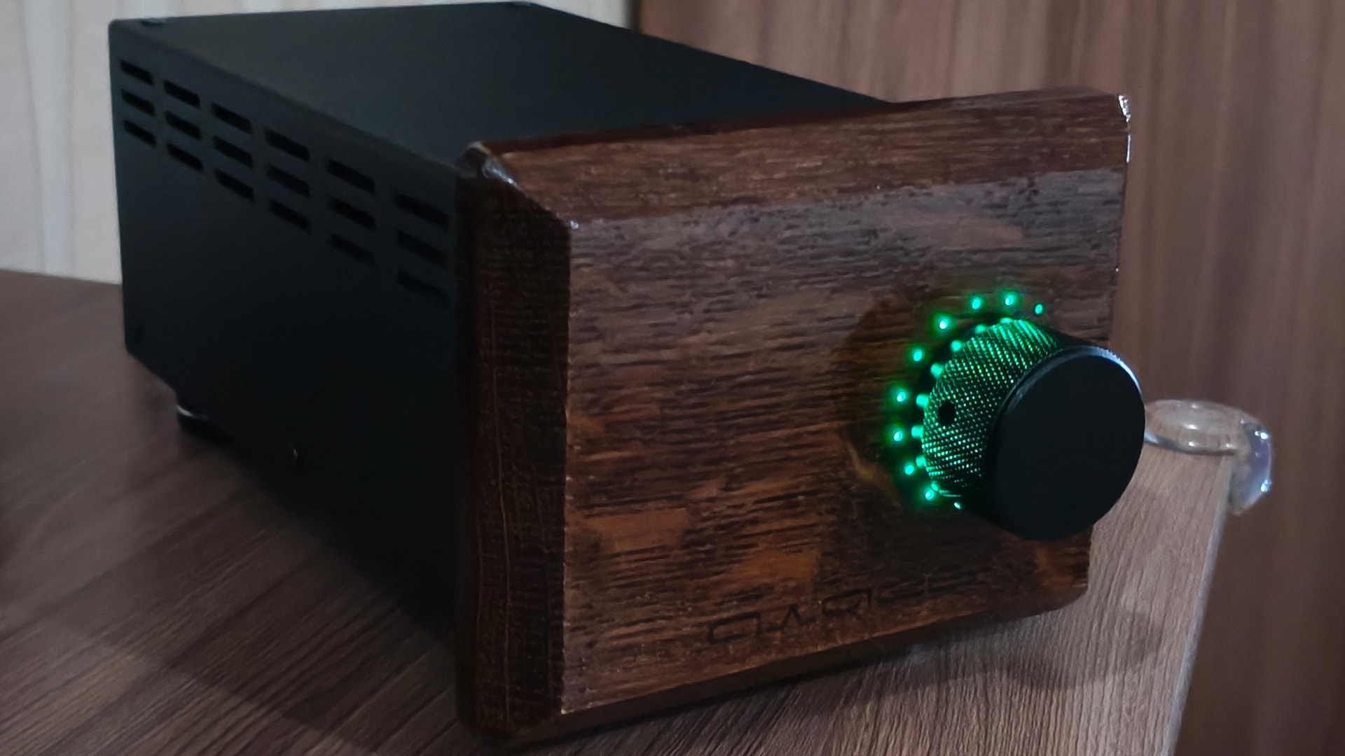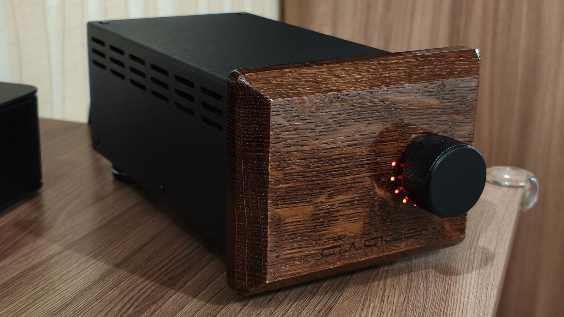 На мой вкус прослеживается явный перебор с выводимой на обозрение пользователя информацией и мне захотелось сделать подобное устройство более сдержанным во внешнем оформлении. В новой версии сборки я решил отказаться от ЖК-индикатора, а круговую светодиодную шкалу спрятать за декоративной деревянной фальшпанелью, выполненной из массива дуба.