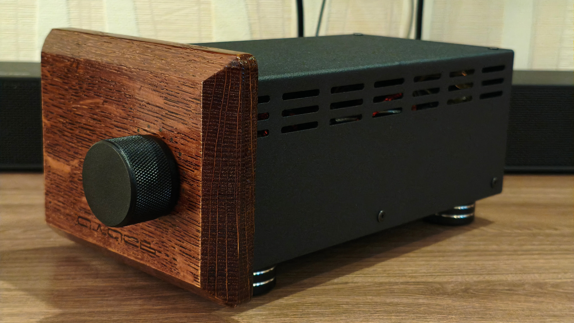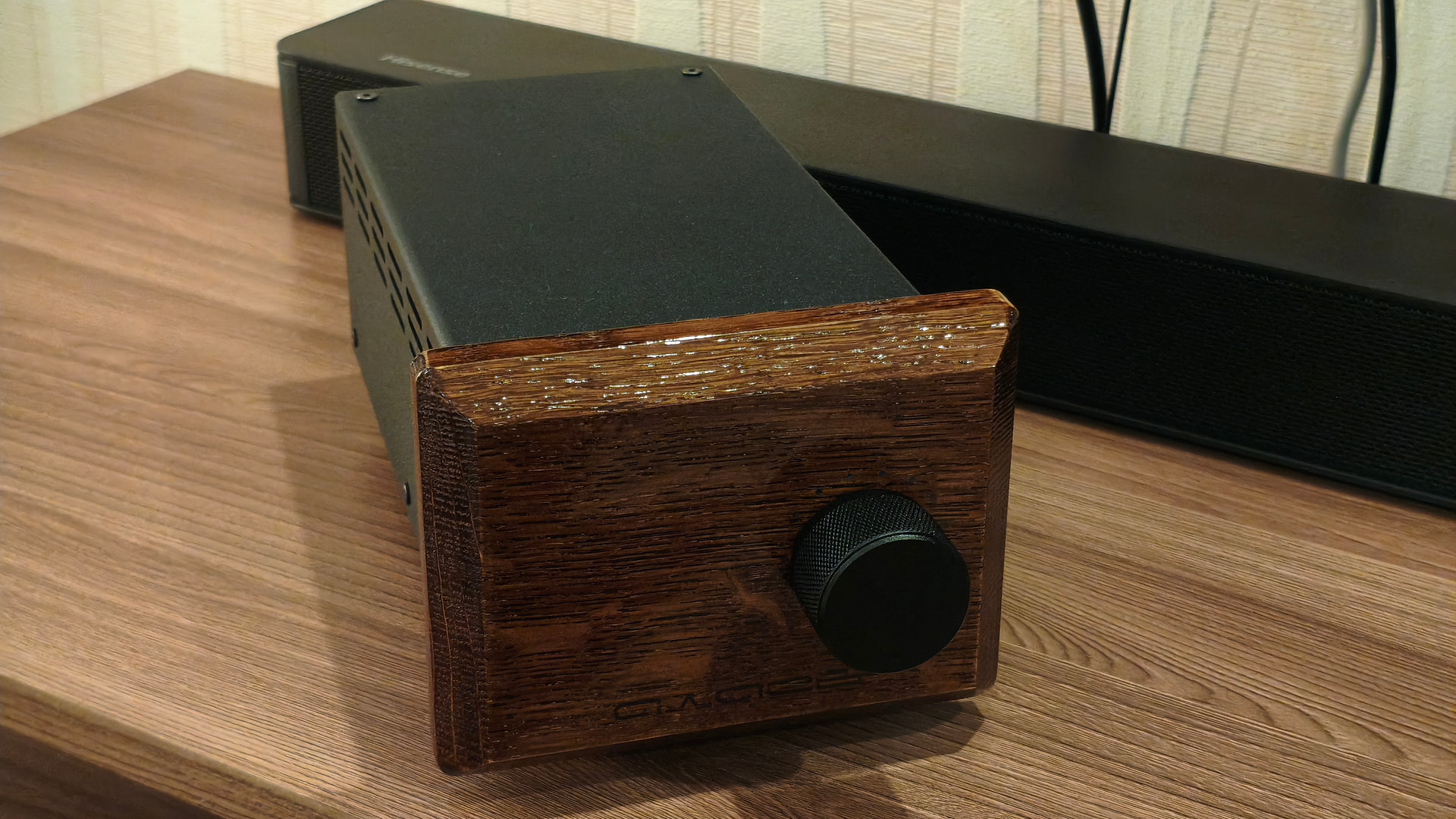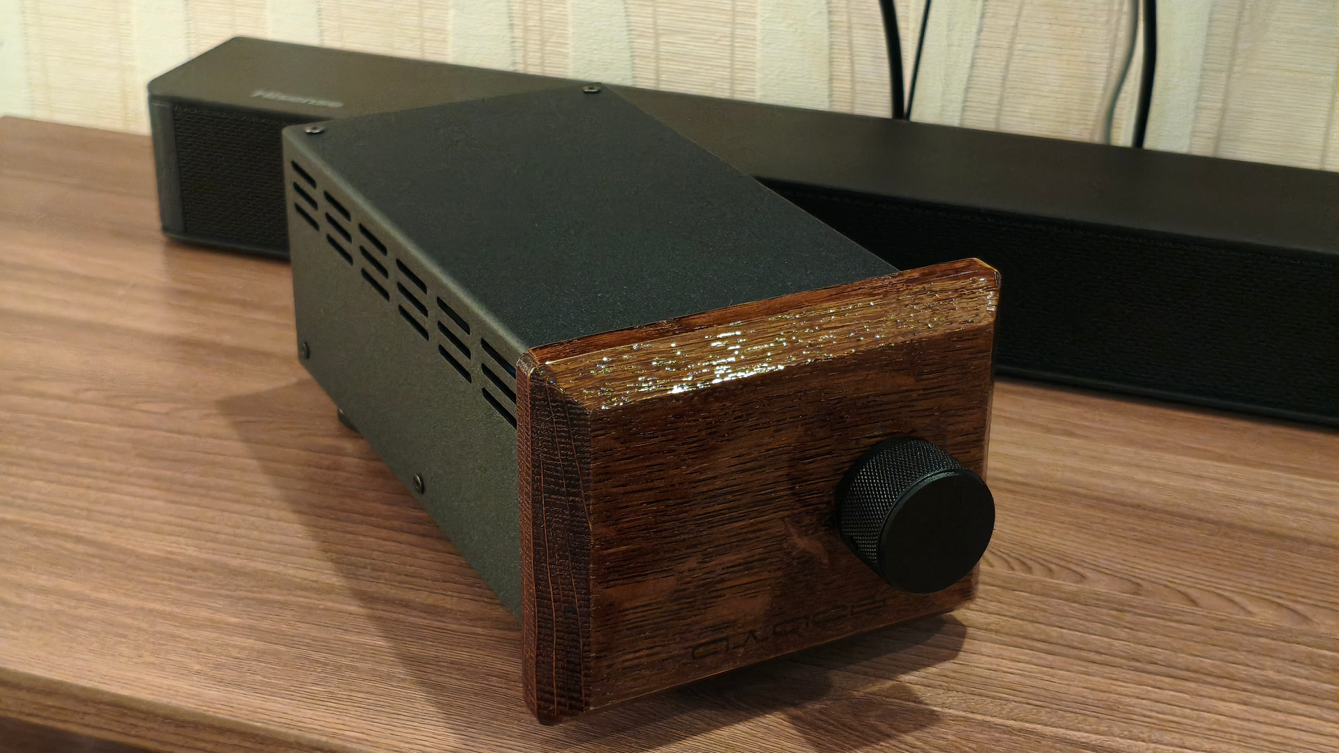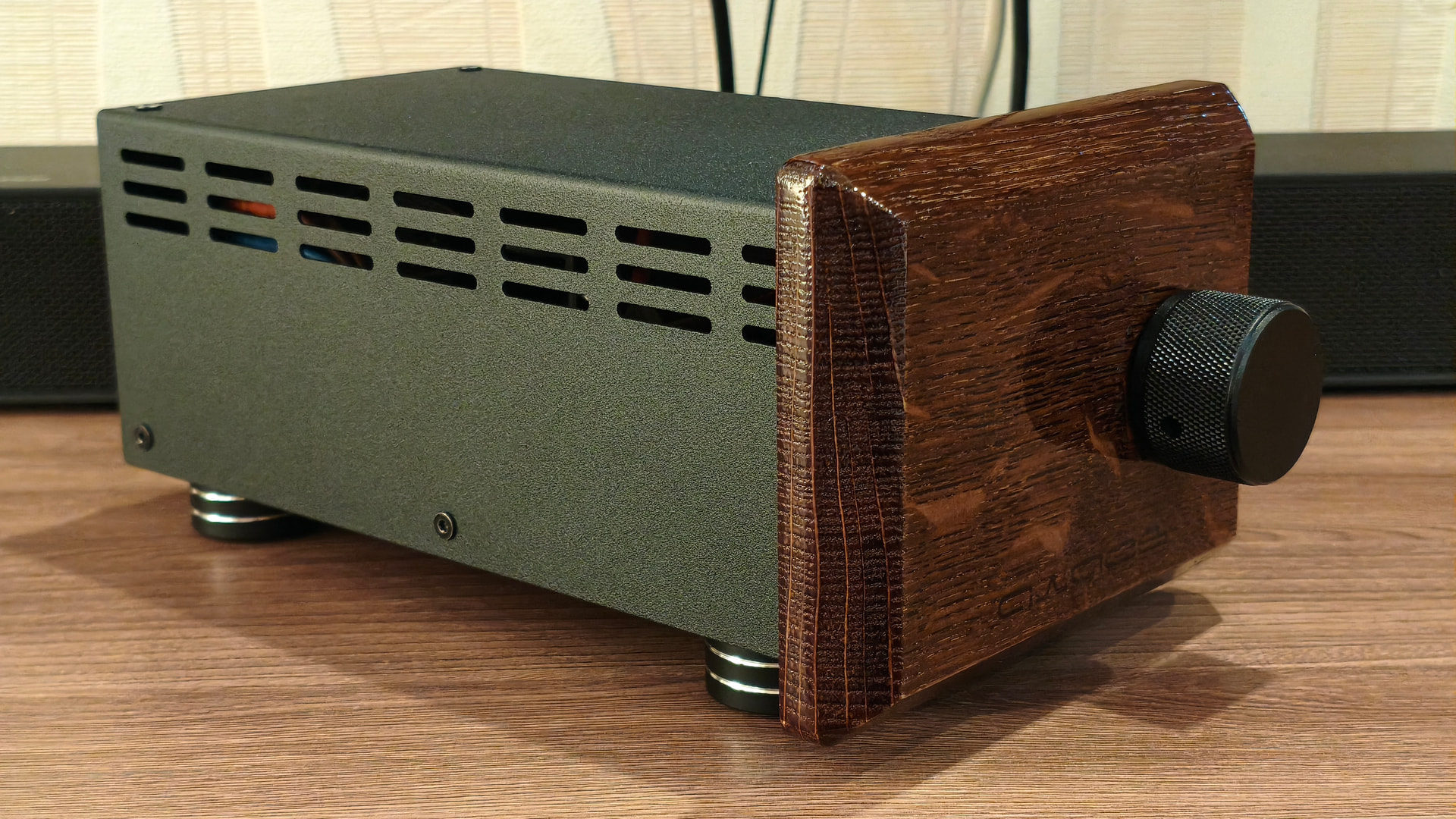 На мой вкус прослеживается явный перебор с выводимой на обозрение пользователя информацией и мне захотелось сделать подобное устройство более сдержанным во внешнем оформлении. В новой версии сборки я решил отказаться от ЖК-индикатора, а круговую светодиодную шкалу спрятать за декоративной деревянной фальшпанелью, выполненной из массива дуба.