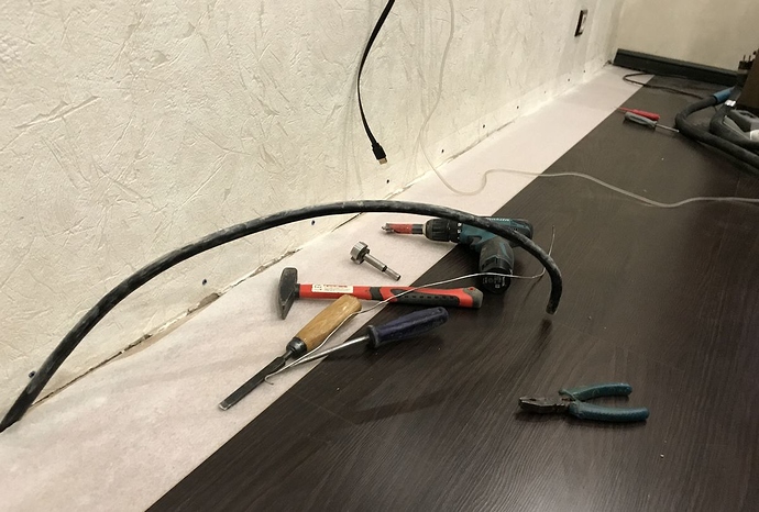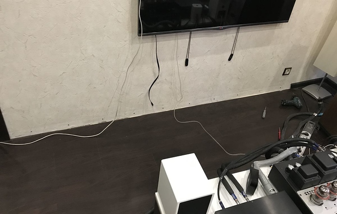 А дальше сложно. Разместить розетку на стене за системой нет возможности, там остекление (ну шторки, все такое). Тянуть кабель от боковой стены не хочется. Вижу такой вариант: кабель выходит из пола и заходит прямо в сетевой фильтр (кстати), который уже спрячу в стойке. Вариант с розеткой в полу как то не очень. Мало ли, вода, еще что…