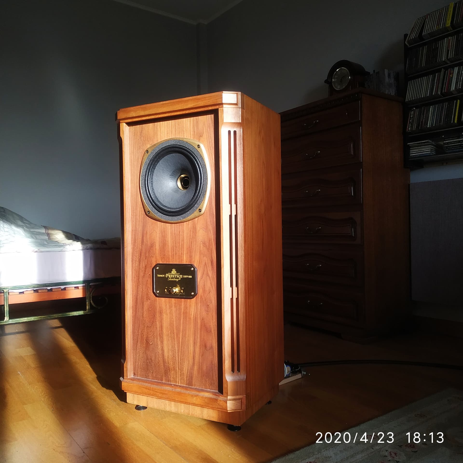 Динамик не должен повредиться, одеваю поверх грилей. Чтобы шпон не затирался, сделал размер чехлов с запасом. Для того, чтобы укрыть, просто поднимаю чехол, выравниваю по краям и отпускаю. Он как бы падает/стекает на АС.
