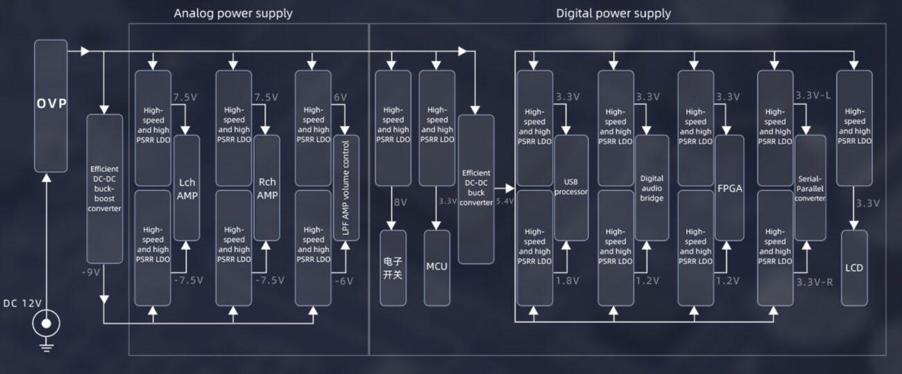 Исходя из структурной схемы питания, для фио надо сделать +/-9В линейные для аналога и 5В линейные для цифры, выкинув при этом соответствующие импульсные преобразователи. По плате тогда не будет импульсных помех от внутренних DC-DC преобразователей. Ну, а самые гурманы могут еще попробовать заменить китайские LDO на хорошие фирменные от ADI или TI.