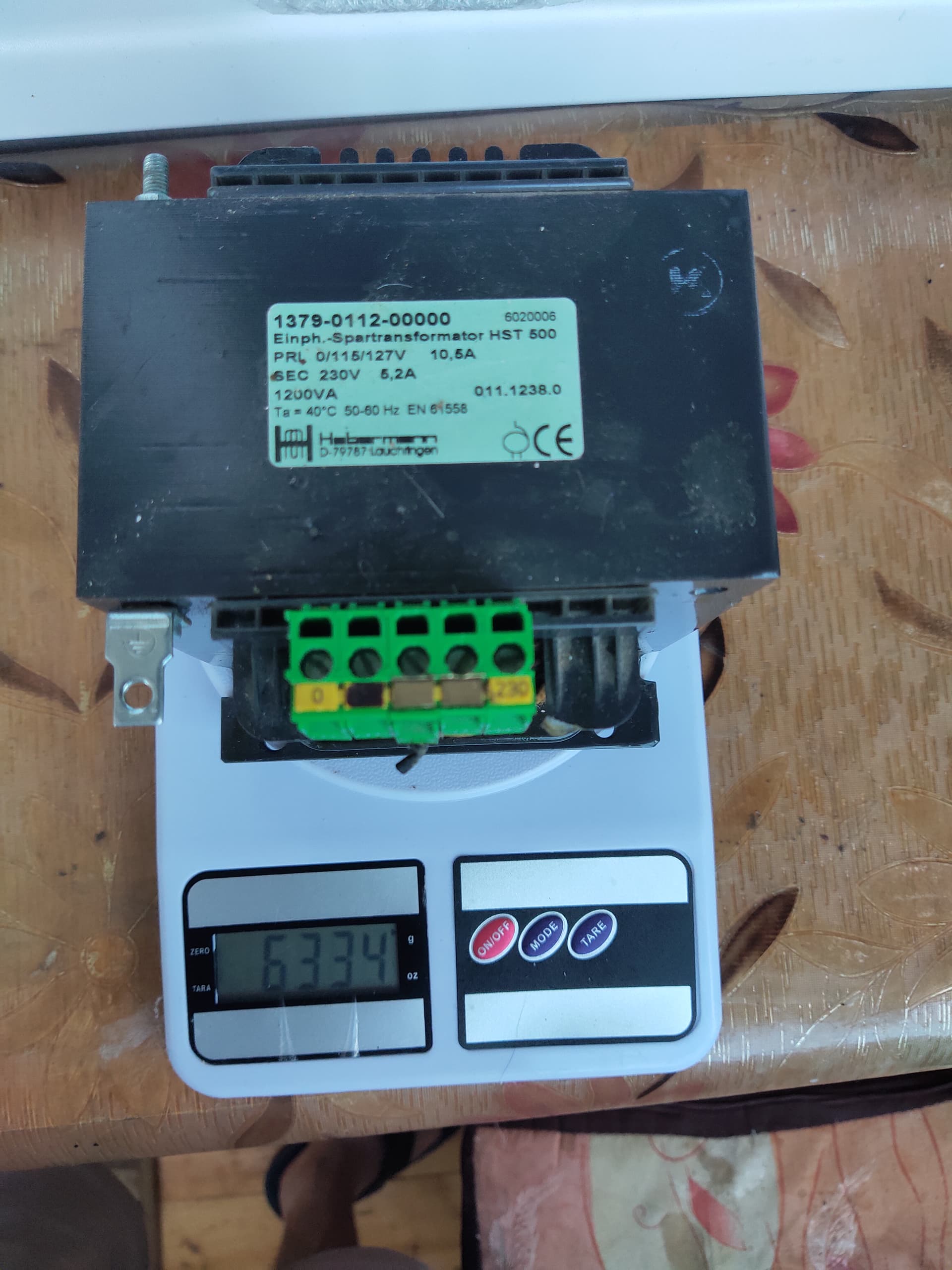 Вот немецкий автотрансформатор. Мощность 1,2кВА, вес 6,3 кг.