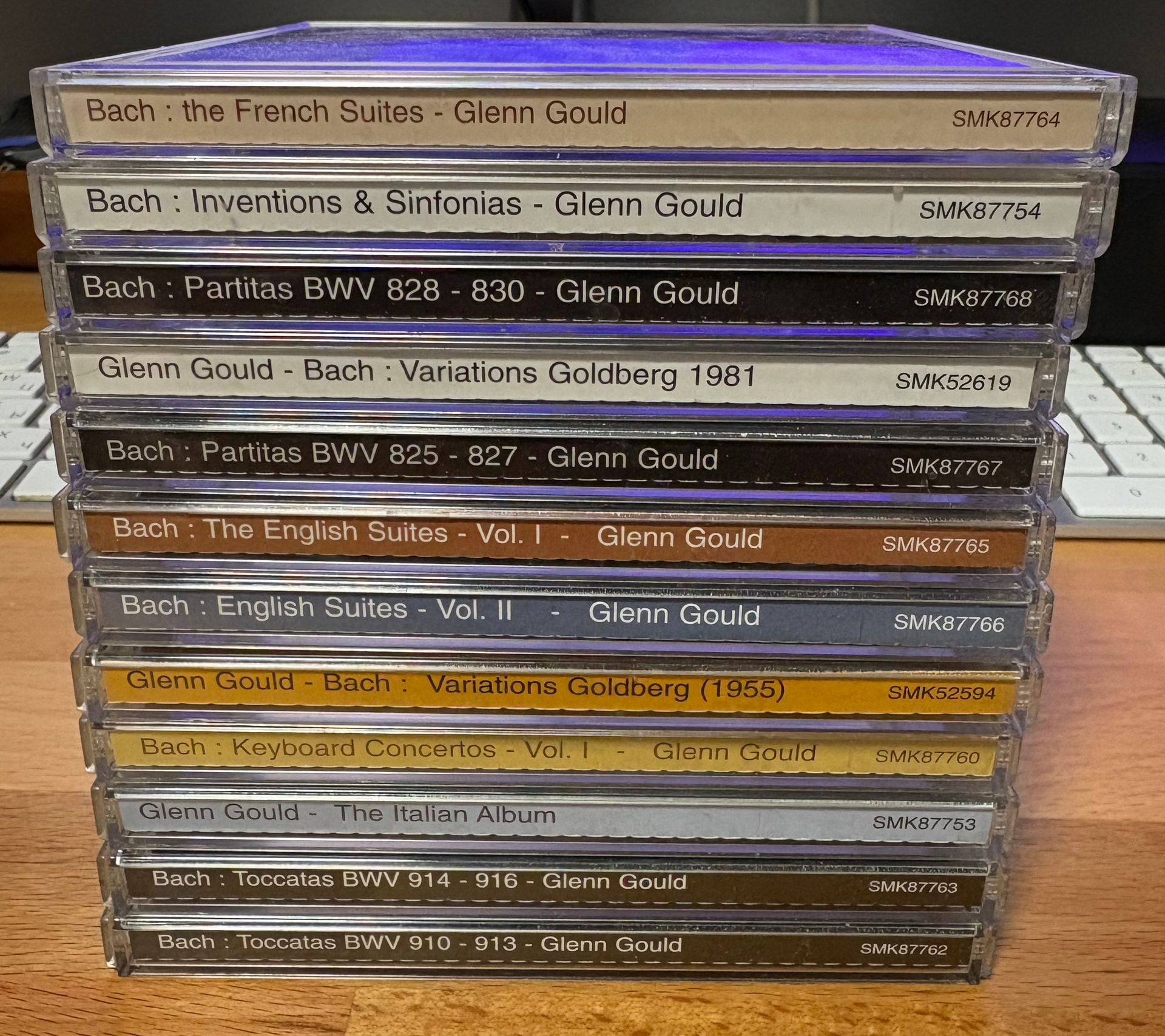 12-дисковая подборка с исполнениями Баха Гульдом. 2002 год, Sony, Austria - покупалось все это новым, и одним изданием - в какую-то картоночку (не бокс) и пленку были затянуты все диски. Из за повреждения эта внешняя картонка не сохранилась.