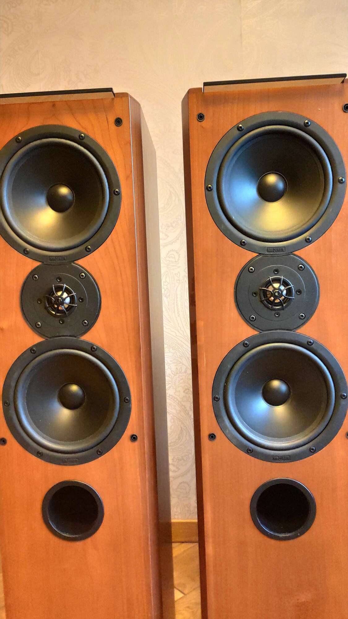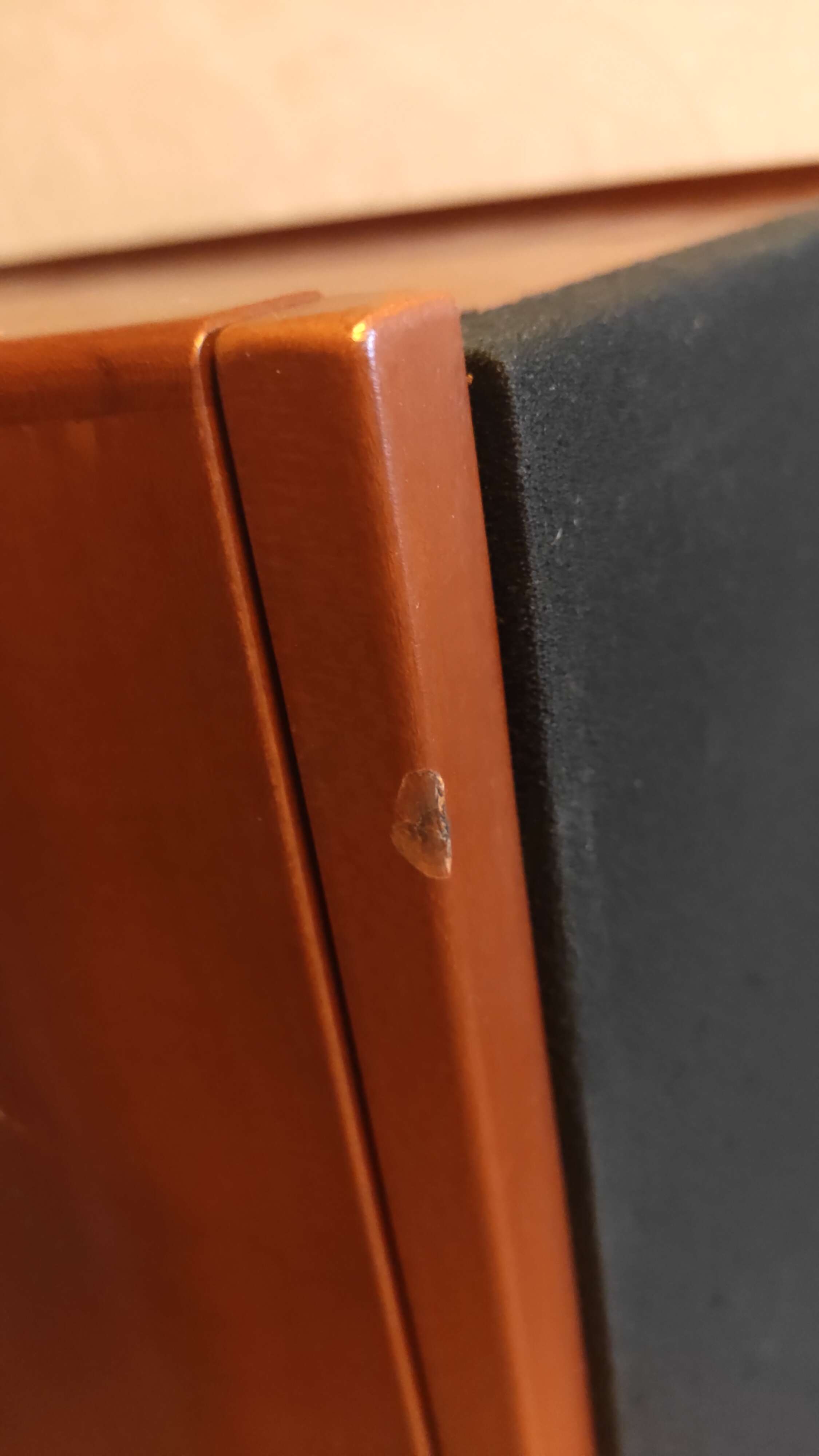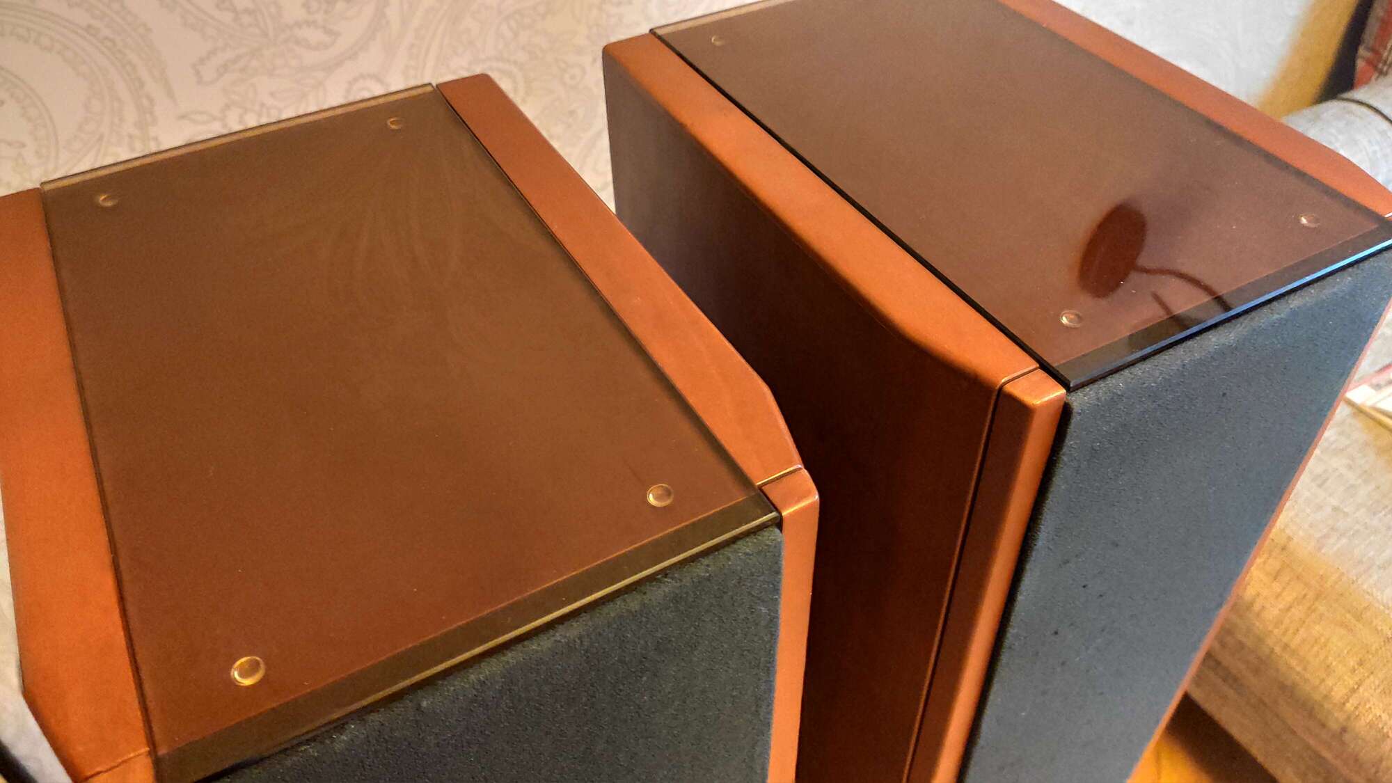 Настоящая немецкая акустика в очень богатом шпоне, выглядят очень впечатляюще - это вторая модель в линейке сверху. Грили на деревянных рамах, ни у кого такого не видел. Играют чисто, но в то же время напористо, услышал много новых деталей на старых записях. Баса в избытке. По состоянию на четвёрку, грили в затяжках, есть мелкие царапки по дереву, скол (см. предпоследнее фото). Но всё это с двух метров уже не разобрать. Динамики в идеале.