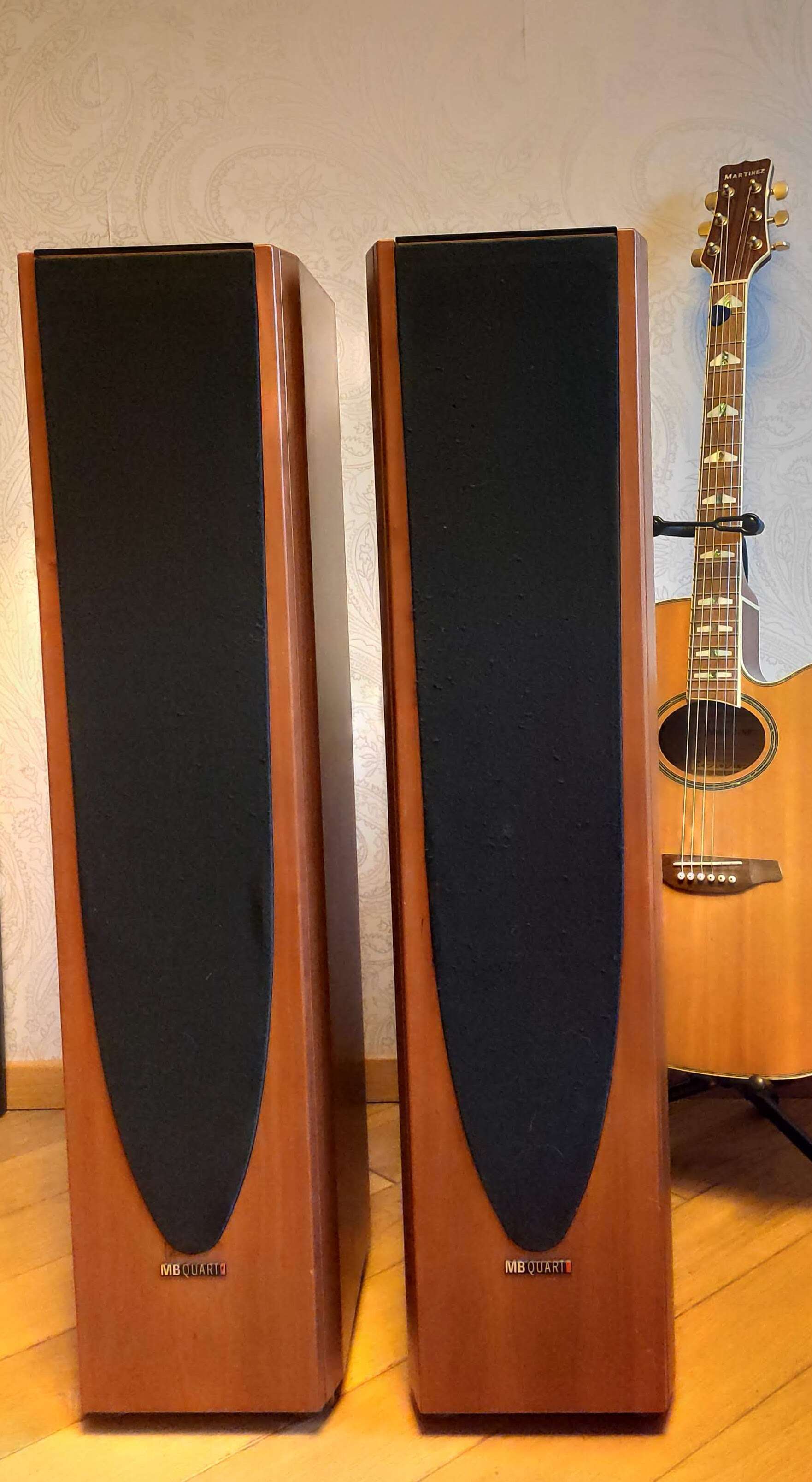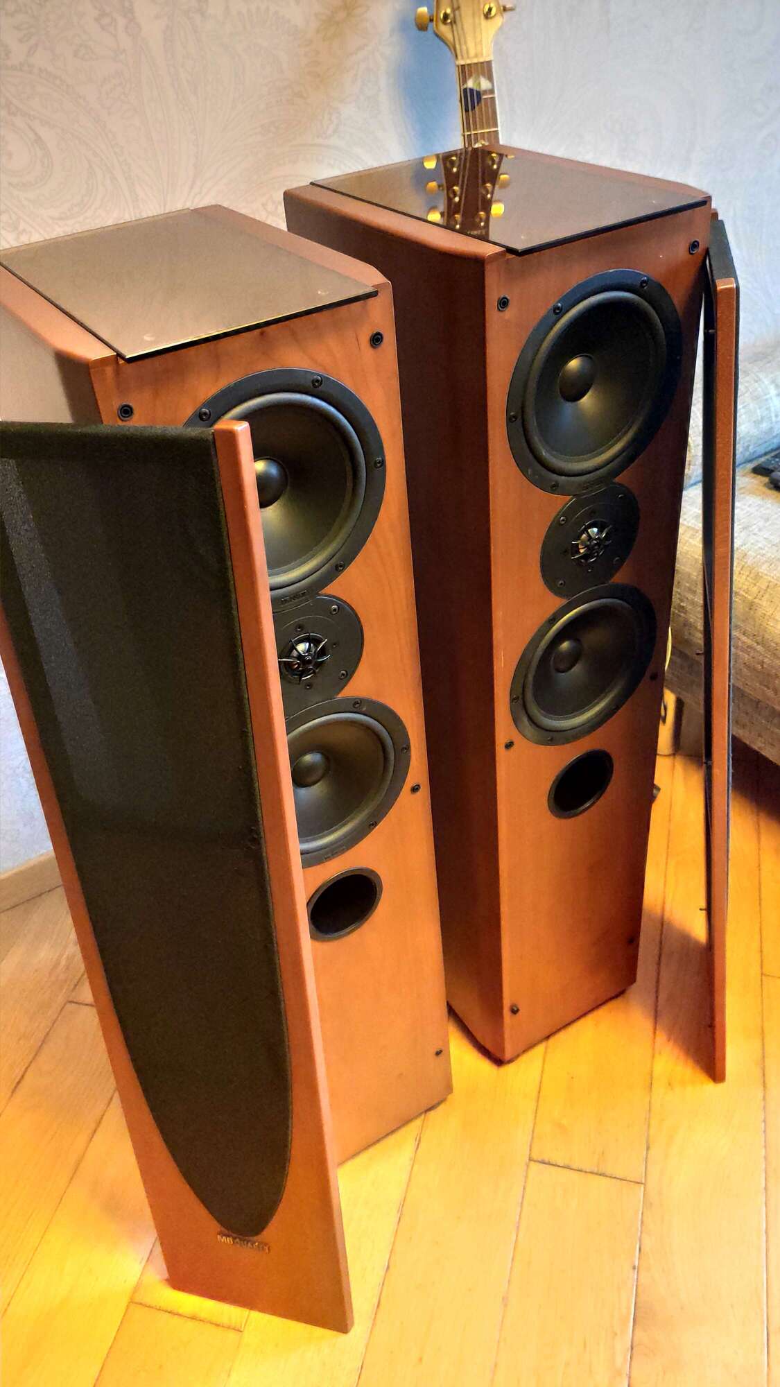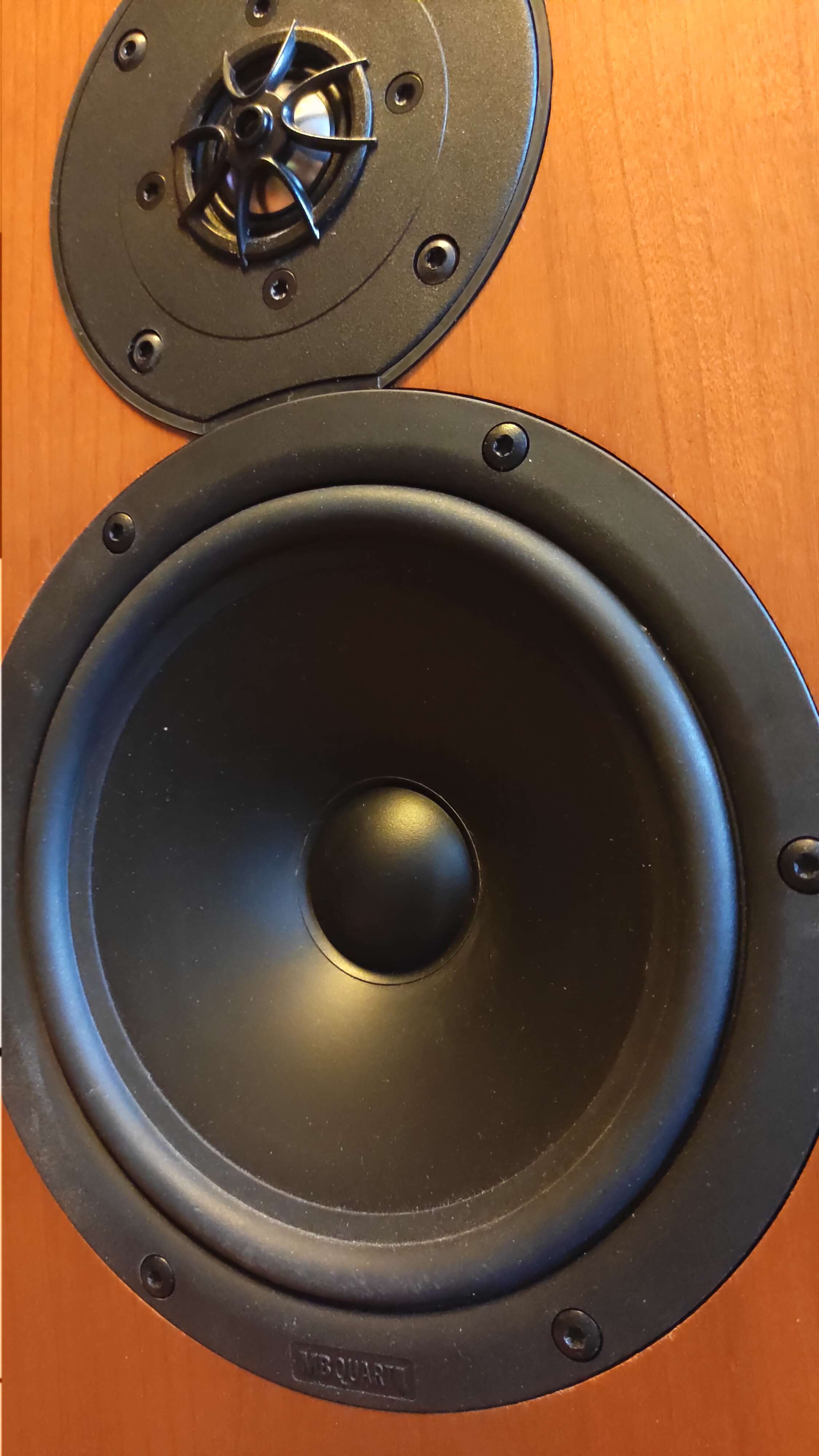 Настоящая немецкая акустика в очень богатом шпоне, выглядят очень впечатляюще - это вторая модель в линейке сверху. Грили на деревянных рамах, ни у кого такого не видел. Играют чисто, но в то же время напористо, услышал много новых деталей на старых записях. Баса в избытке. По состоянию на четвёрку, грили в затяжках, есть мелкие царапки по дереву, скол (см. предпоследнее фото). Но всё это с двух метров уже не разобрать. Динамики в идеале.