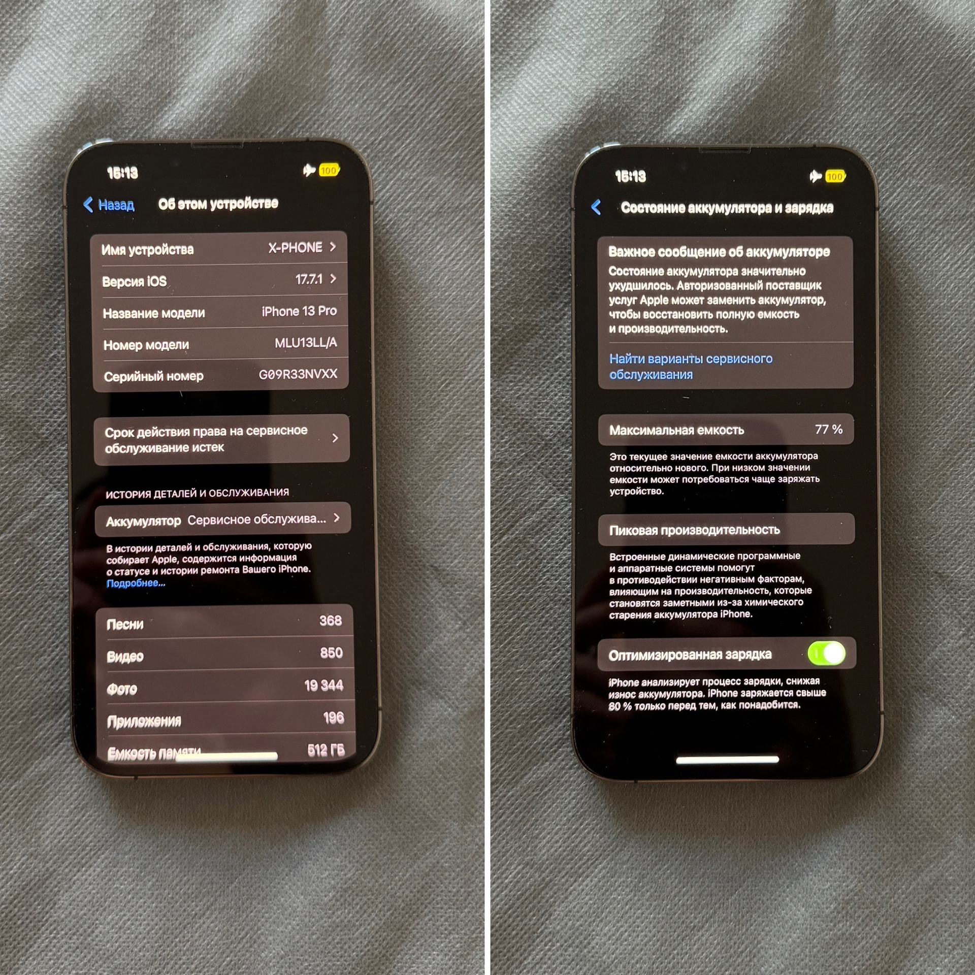 Телефон произведен в 2022/07/09, т.е не из первых партий. Установлен iOS 17.7.1, от iCloud отвязан, уровень аккумулятора 77%, последний год носился без защитного стекла, но всегда в чехлах. Состояние отличное, все работает. Ничего не вскрывалось, не ремонтировалось, не топилось.