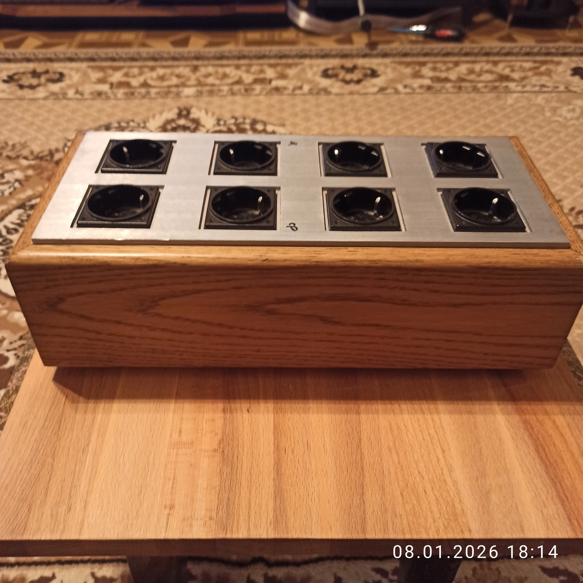 Корпус из массива светлого дуба. Алюминиевый подрозетник толщиной 1.3см.. Розетки на 16а хорошо держут вилки. Незначительные следы эксплуатации. Вес 3.5 кг. Вышлю из Волгограда. Цена для бара 14 тр. Это изделие от JazzClub из Махачкалы.