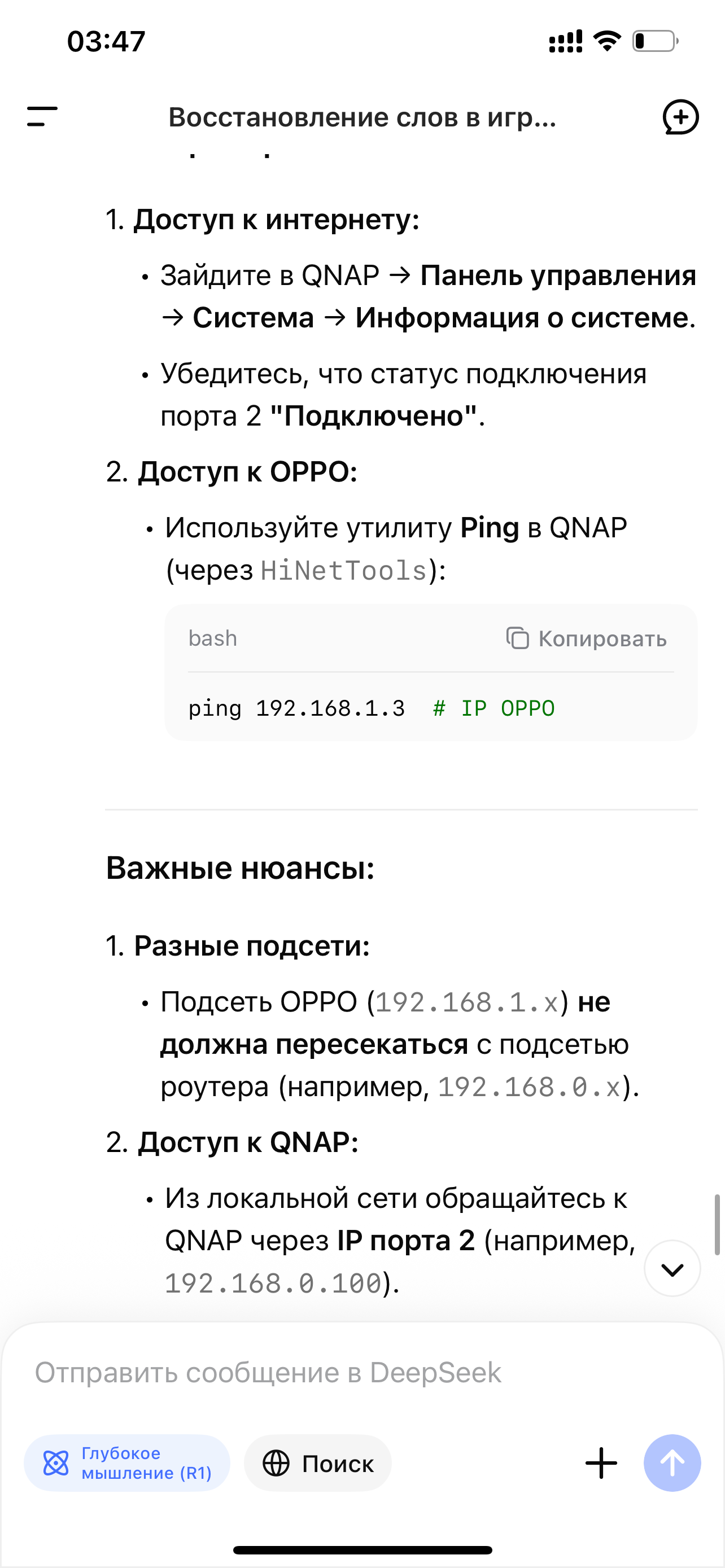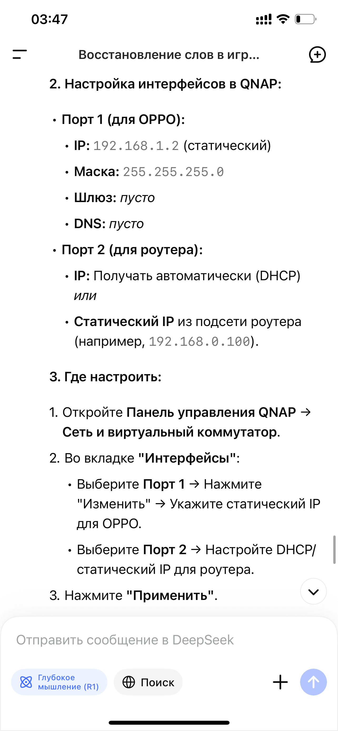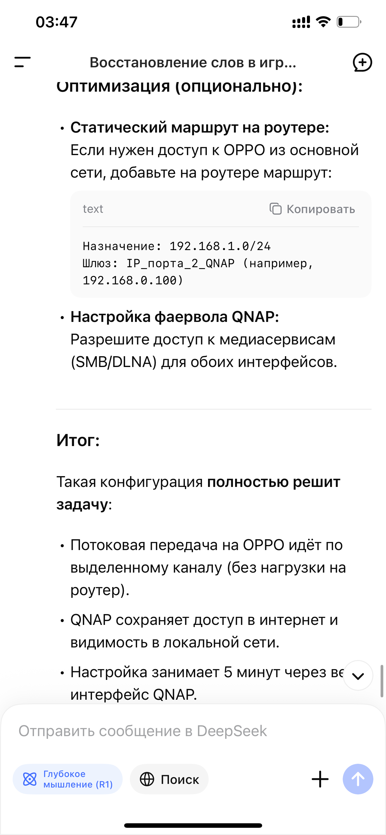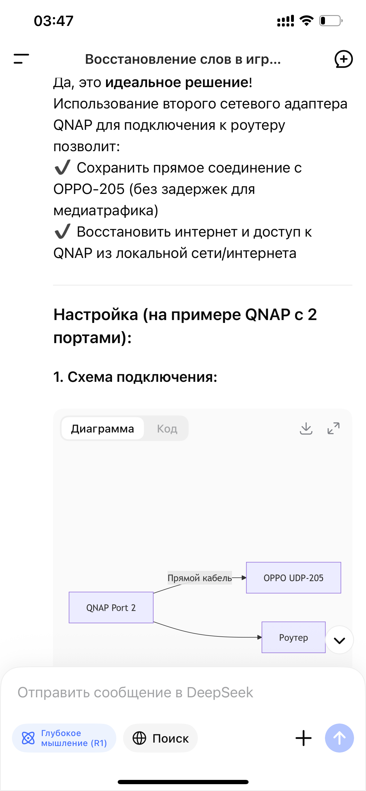Решил Oppo-205 напрямую подключить к qnap по lan. Тк в qnap 2 сетевых адаптера, второй адаптер хочу оставить с настройкой на роутер для заливки контента. Если не заливаю, буду кабель отсоединять от роутера, что бы не «шумел». Qnap на линейнике JDV. ИИ тоже так рекомендует.