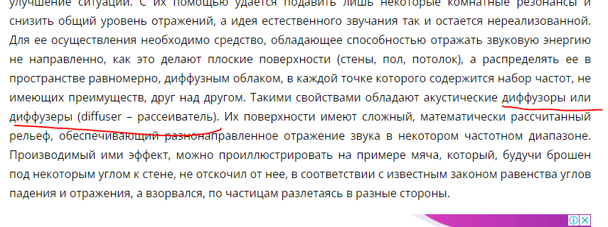А откуда собственно инфа, что рассеиватель должен отражать в сторону слушателя ? Не противоречит ли это самой идее рассеивания, которая призвана увеличить соотношение прямого и отраженного звука в зоне прослушивания в пользу первого? А отраженный должен прилетать, но не после первого отражения, а позже, после нескольких отражений и ослабленным.
