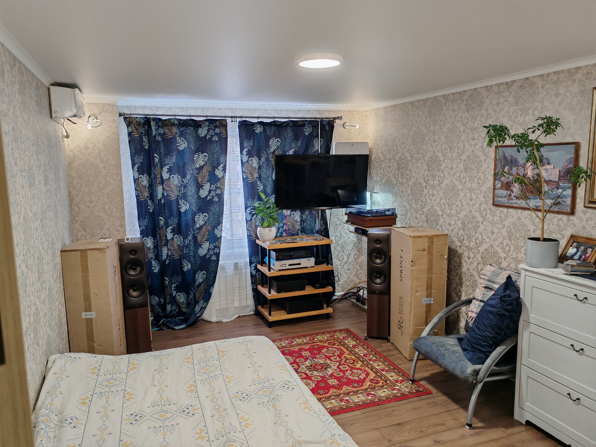 Что имеем: комнату универсального назначения, систему, подобранную под мои вкусы и возможности с напольными колонками по короткой стене. Слушаю с тахты, по диагонали, расположение колонок перепробовано в значительных диапазонах и оставлено с некими компромиссами.