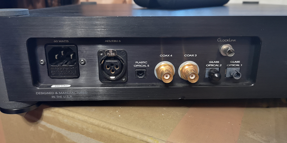 На задней панели - сетевой инлет, набор цифровых входов (2 оптических стеклянных стандарта ST, 2 S/PDIF с позолоченными разъемами BNC, пластиковая оптика Toslink и EAS/EBU), оптический ST разъем для синхронизации с транспортом, а также, балансные и не балансные аналоговые выходы.