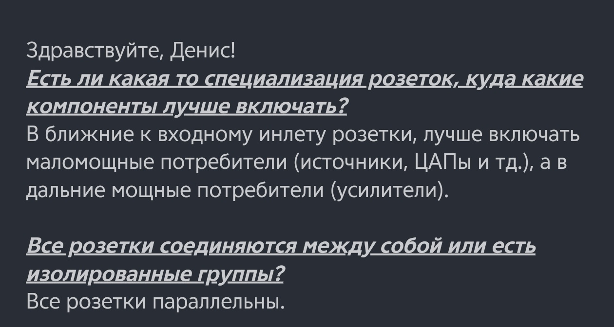 Пока не могу проверить лично. Но вот фото моего izt-600 - две американские розетки SR Purple. Получается нижняя и самая дальняя от инлета лучше по звуку?