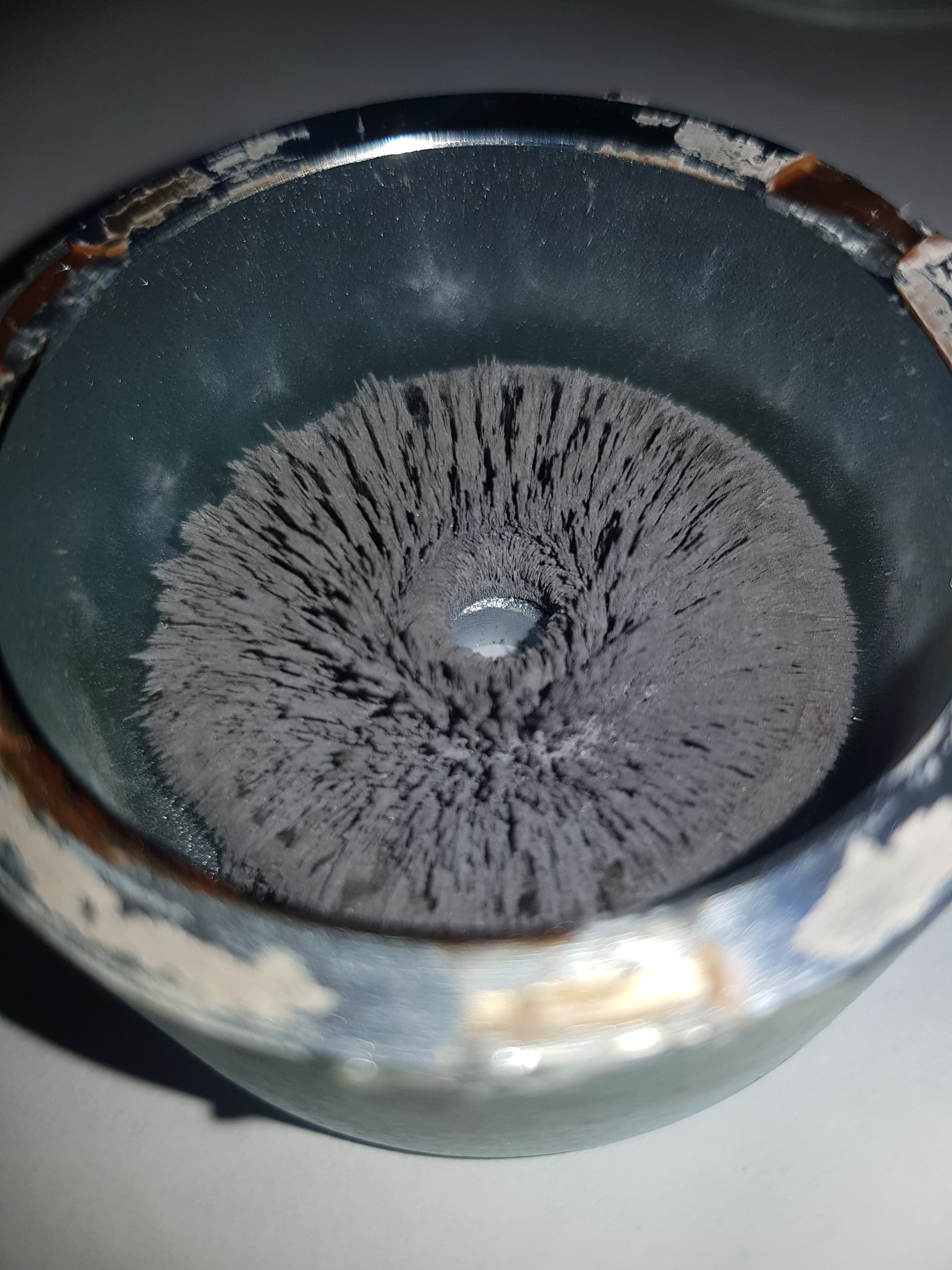 Такое часто случалось на ранних неодимовых твитерах - таблетках, типа JBL Нотридж, и т.п Неодим сильно окисляется на воздухе если хромирование магнитов с дефектом. Магнит очищается от пушистого окисла