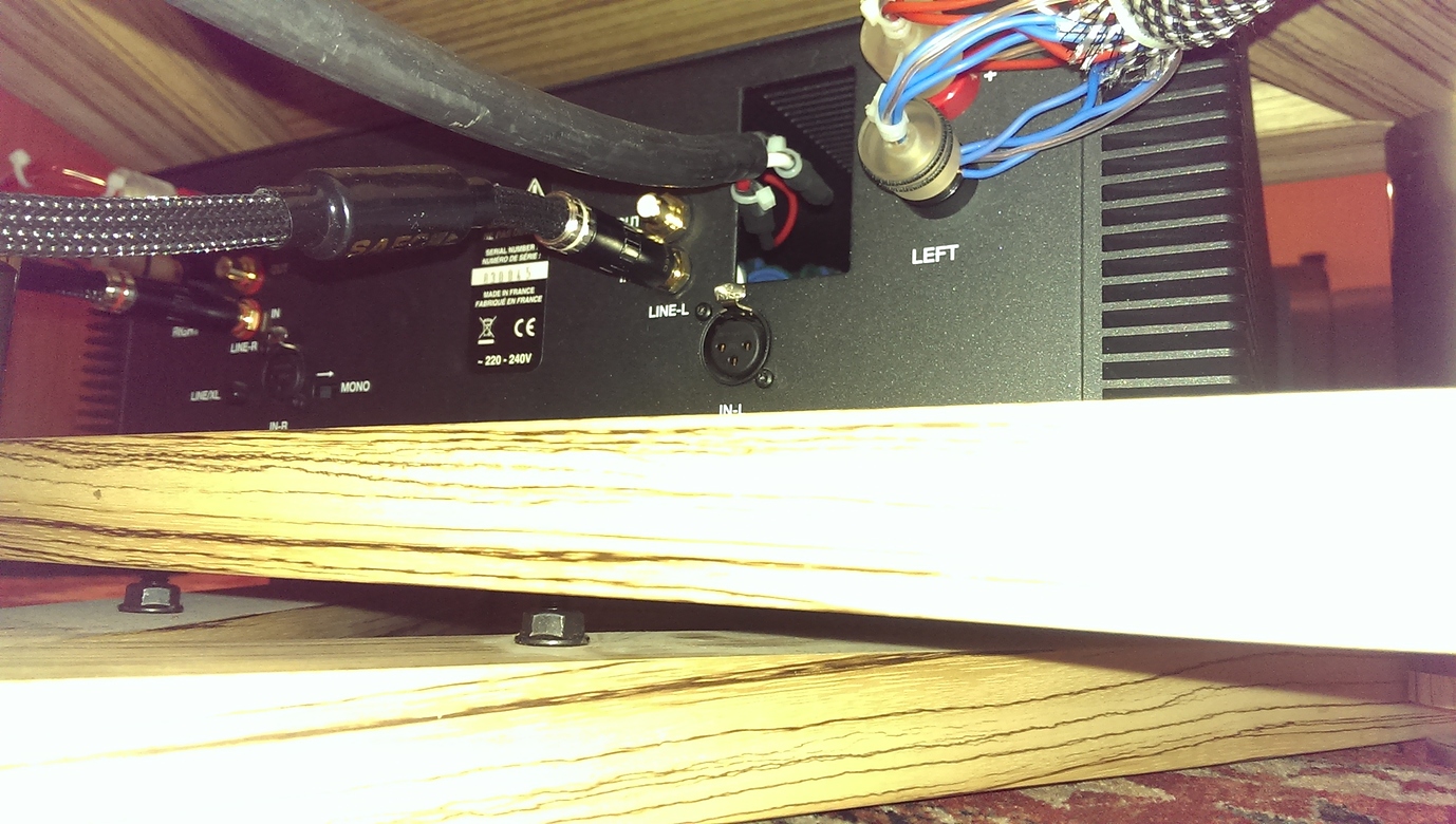 Разрезал пополам один из акустических кабелей Neotech NES-3001 (можете посмотреть на него здесь - http://dastereo.ru/t/akusticheskij-kabel-neotech-nes-3001-2-5-m-64-ot-ritejla/4530 кстати его жилы использовались для перемычек) снял разъемы, заново зачистил 16 моножил с каждого конца. И подключил эти 125 см. куски (без разъемов) к мощнику и АС.