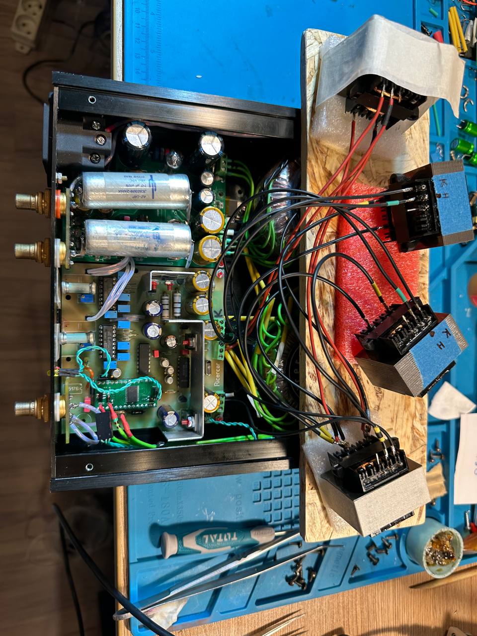 Человек оказался с пытливым умом, сильно разбирающийся в звуке и электронике. После некоторых обсуждений и консультаций, он убрал все лишние, по его мнению, элементы, заменил некоторые компоненты, а так же сориентировал их по направлению. Так же вся цифровая часть была переведена на ОППВ питание с полностью раздельными трансформаторами ![]()