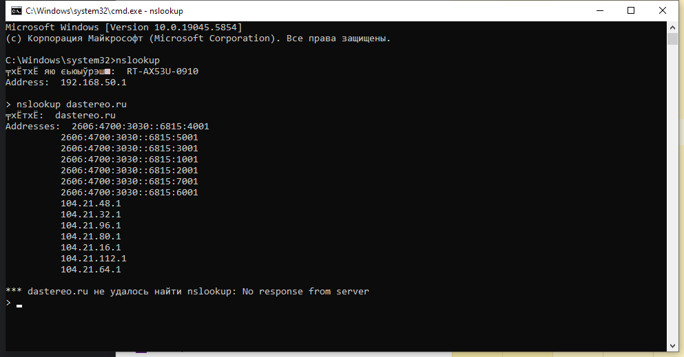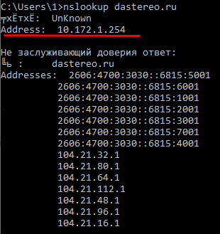 В консоли выполните команду nslookup dastereo.ru и покажите вывод. Должен быть примерно такой (подчеркнутым - ip вашего маршрутизатора)