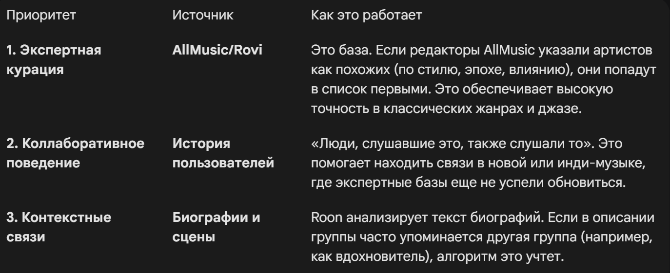 Экспертные метаданные: Roon лицензирует профессиональные базы данных (в первую очередь AllMusic / TiVo, а также MusicBrainz). В этих базах музыкальные критики и музыковеды вручную прописывают связи: «Если вам нравится Pink Floyd, вам, вероятно, понравится Alan Parsons Project». Это «человеческий» слой рекомендаций.