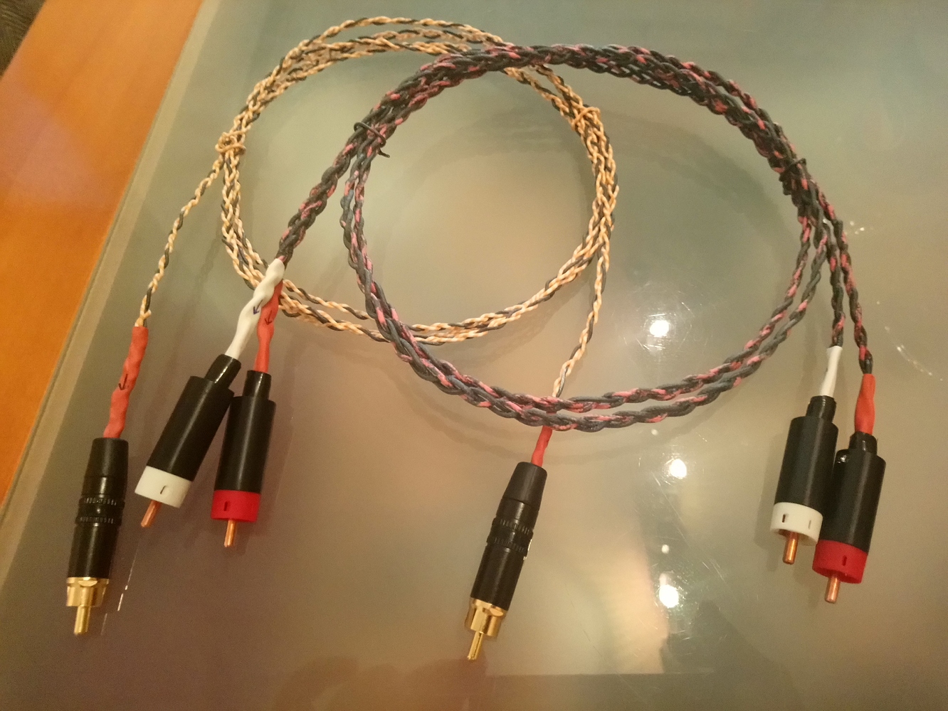 -=SAMOPLЁT=- Межблочная пара, свитая из винтажных моножил Western Electric 1940-1950х гг в тканой изоляции. Теллуревые разъемы типа Bullett plug RCA - RCA.