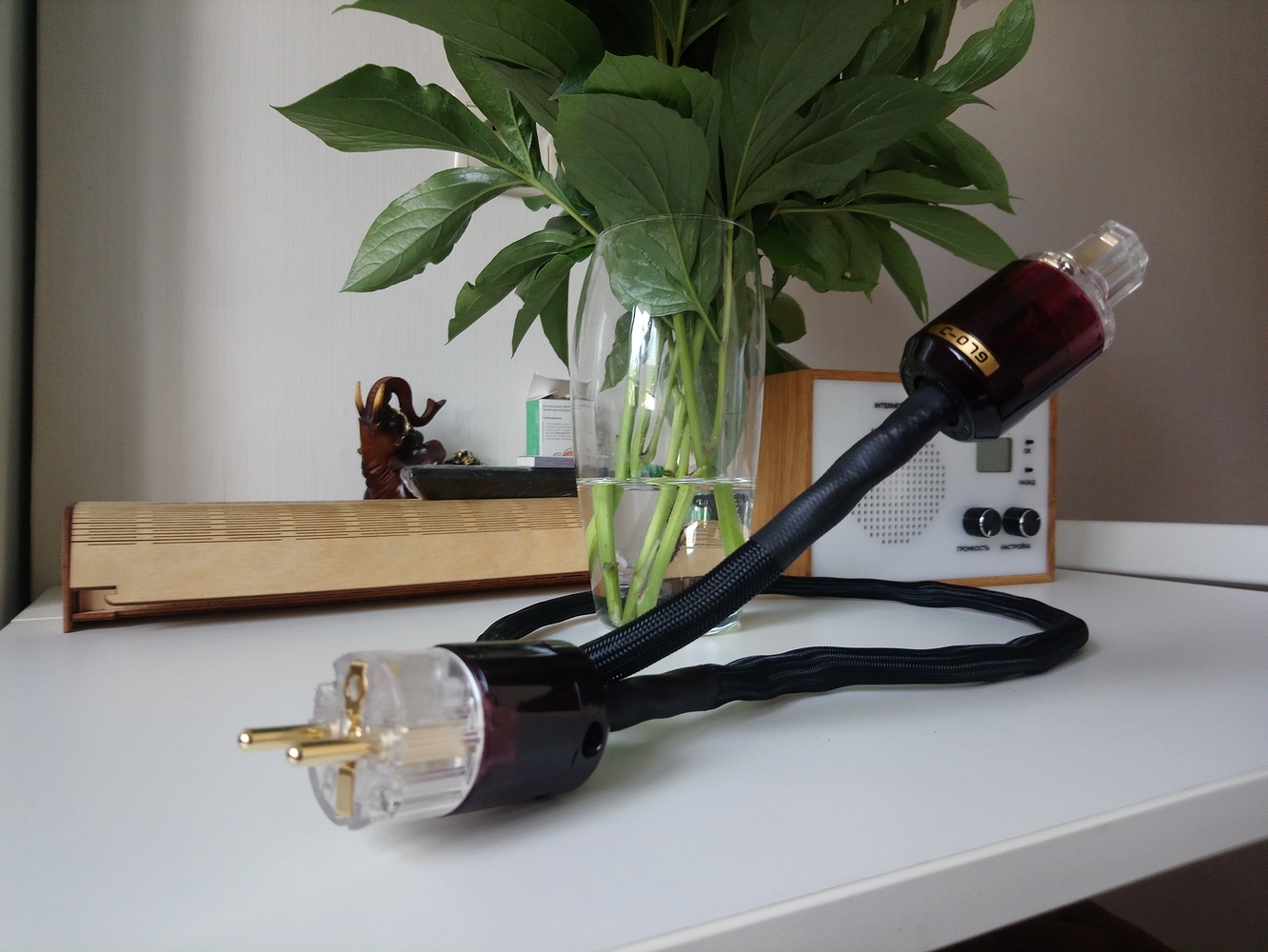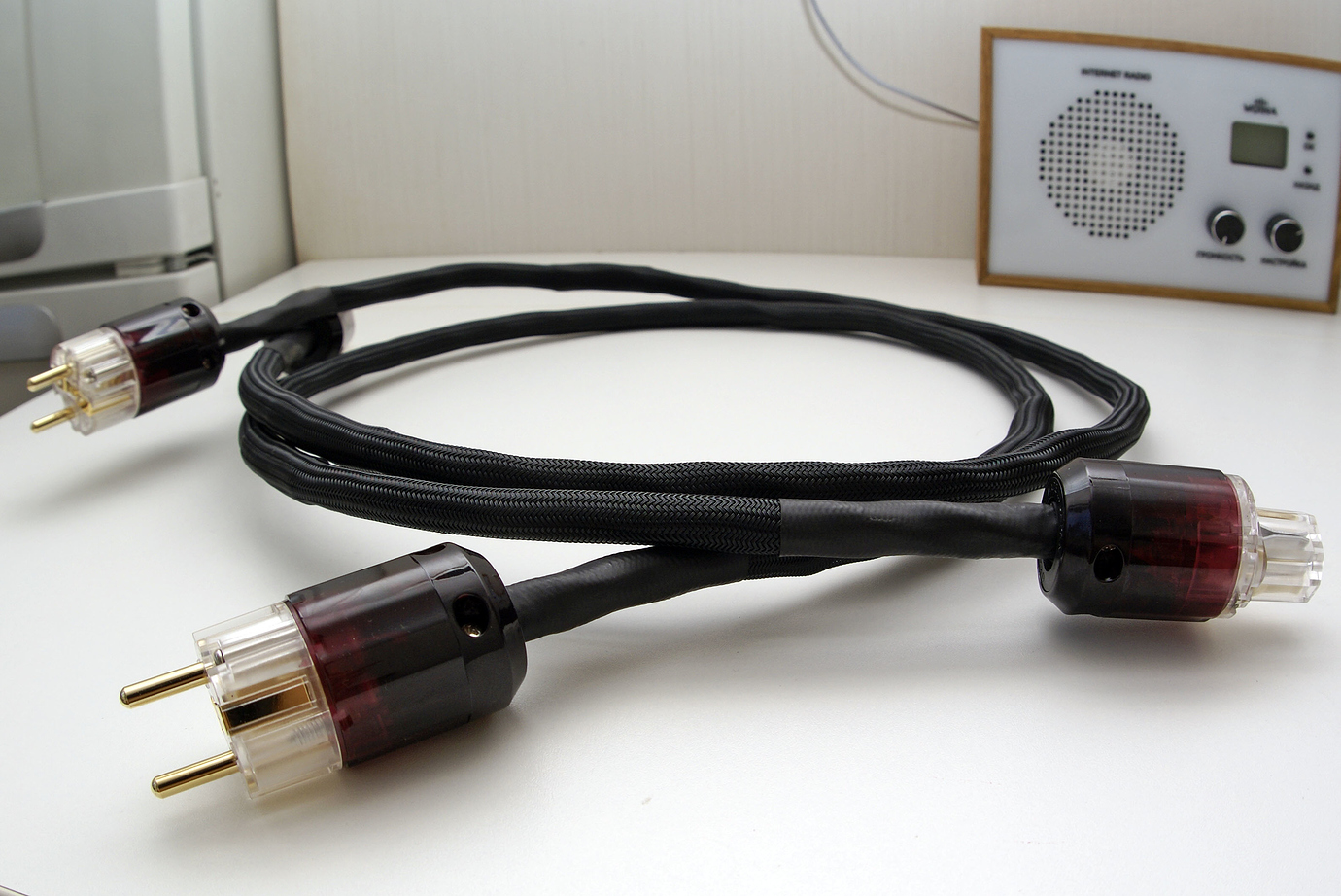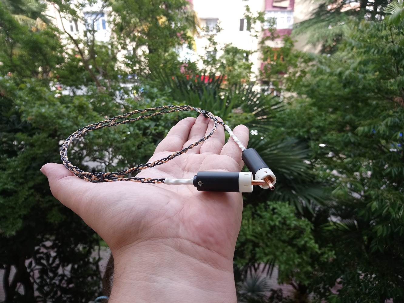 Я долго шел к этому моменту, перепробовал массу разного сырья и мой вывод однозначен. Для открытия звука акустический кабель должен быть моножильным и моножила должна быть как можно древнее. Данный экземпляр свит из 4х моножил сечением 2 квадрата каждая, длина 3 метра в плече. Соответственно, всего в нем 12 метров драгоценной жилы, в тканой изоляции, пропитанной воском, сверху укрыт “змеиным” кожухом; гарды из фрезерованного алюминия, высококачественные разъемы типа “банан”. Фото: