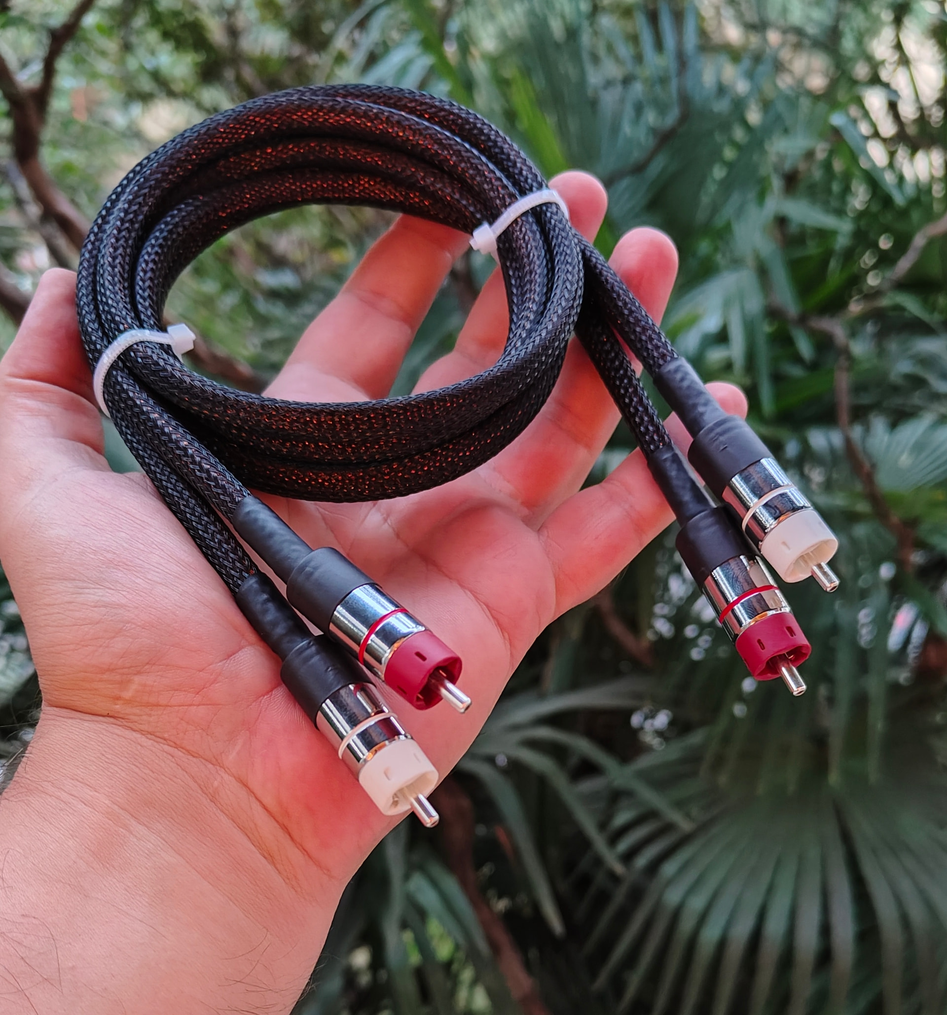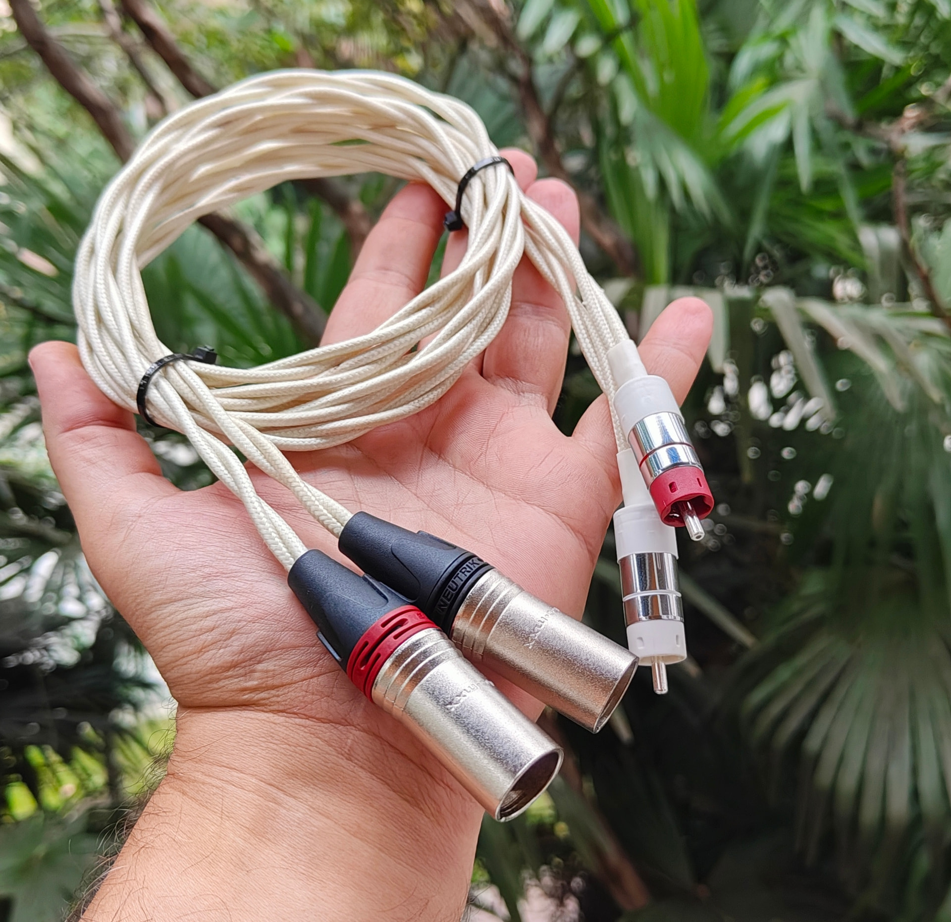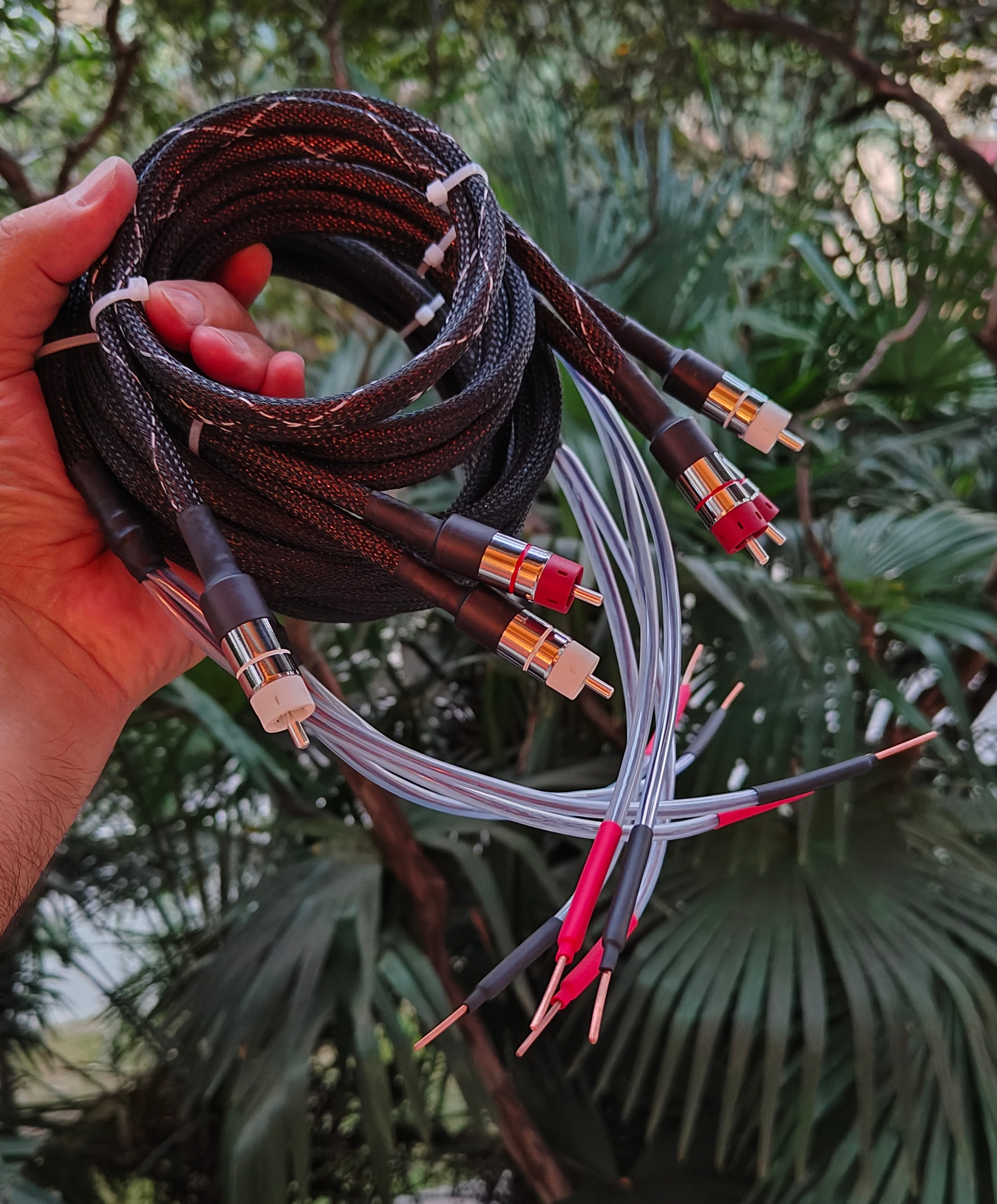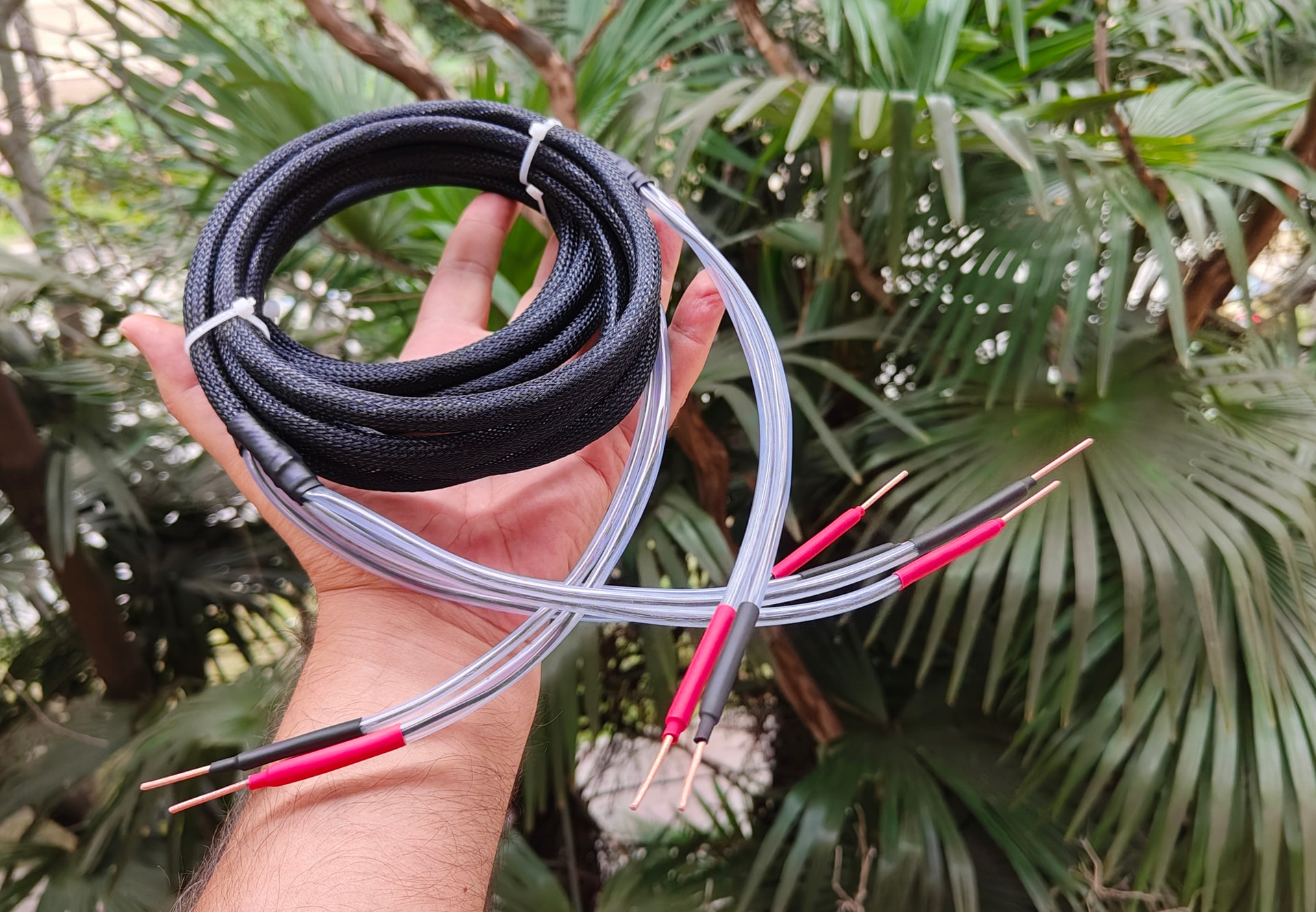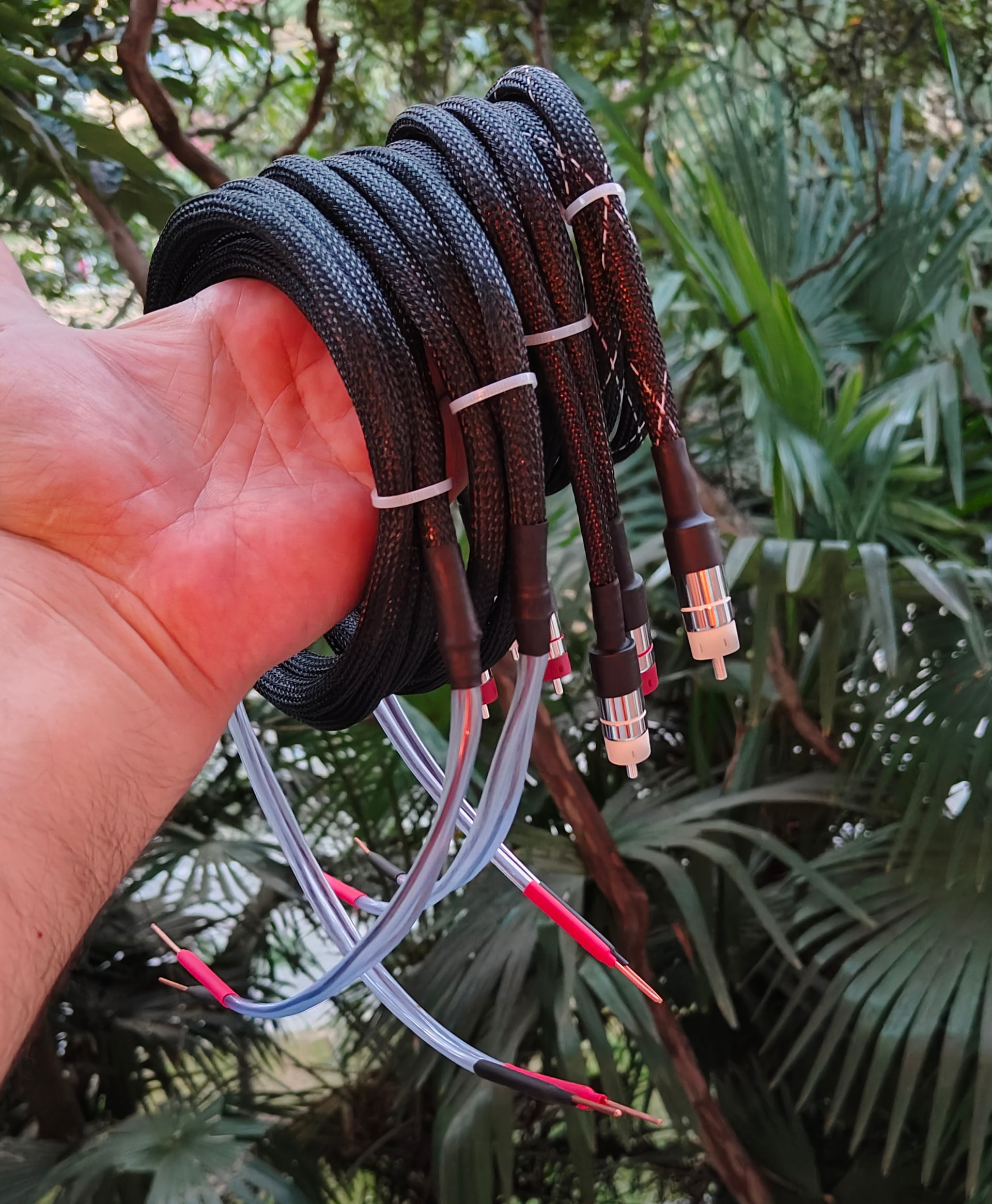 Акустическая пара на винтажной моножиле в воздушном диэлектрике, межблочная пара и коаксиал на плоской винтажной моножиле в воздухе с двойным экранированием по технологии Айконокласт, силовые кабели на винтажной моножиле в воздушной изоляции:
