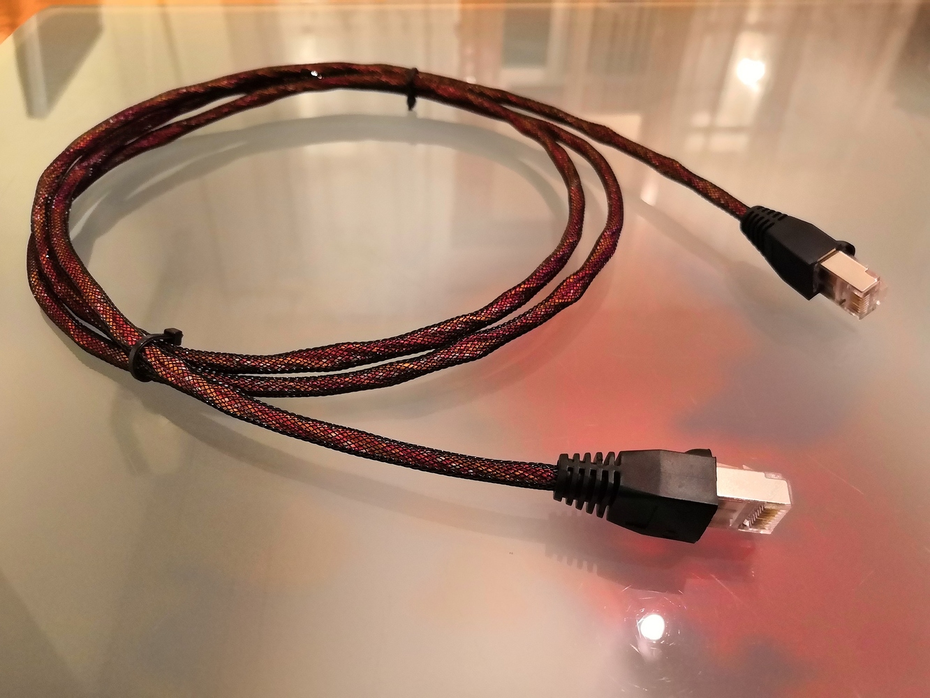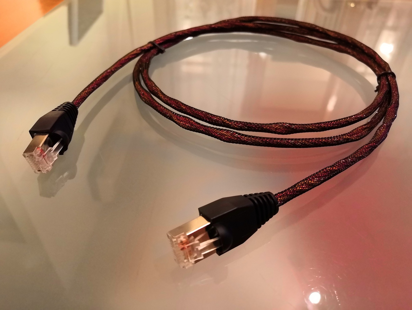 Взял я приличные разъемы Cabeus, отмотал на две 1,5-метровые пары свою ветхозаветную моножилу Western Electric, эмалированную черным лаком и покрытую шелком. Свил пары разным шагом, обернул готовые пары вокруг общего центра, обжал и получил вот такой домашний патчкорд U\UTP для 100мбит: