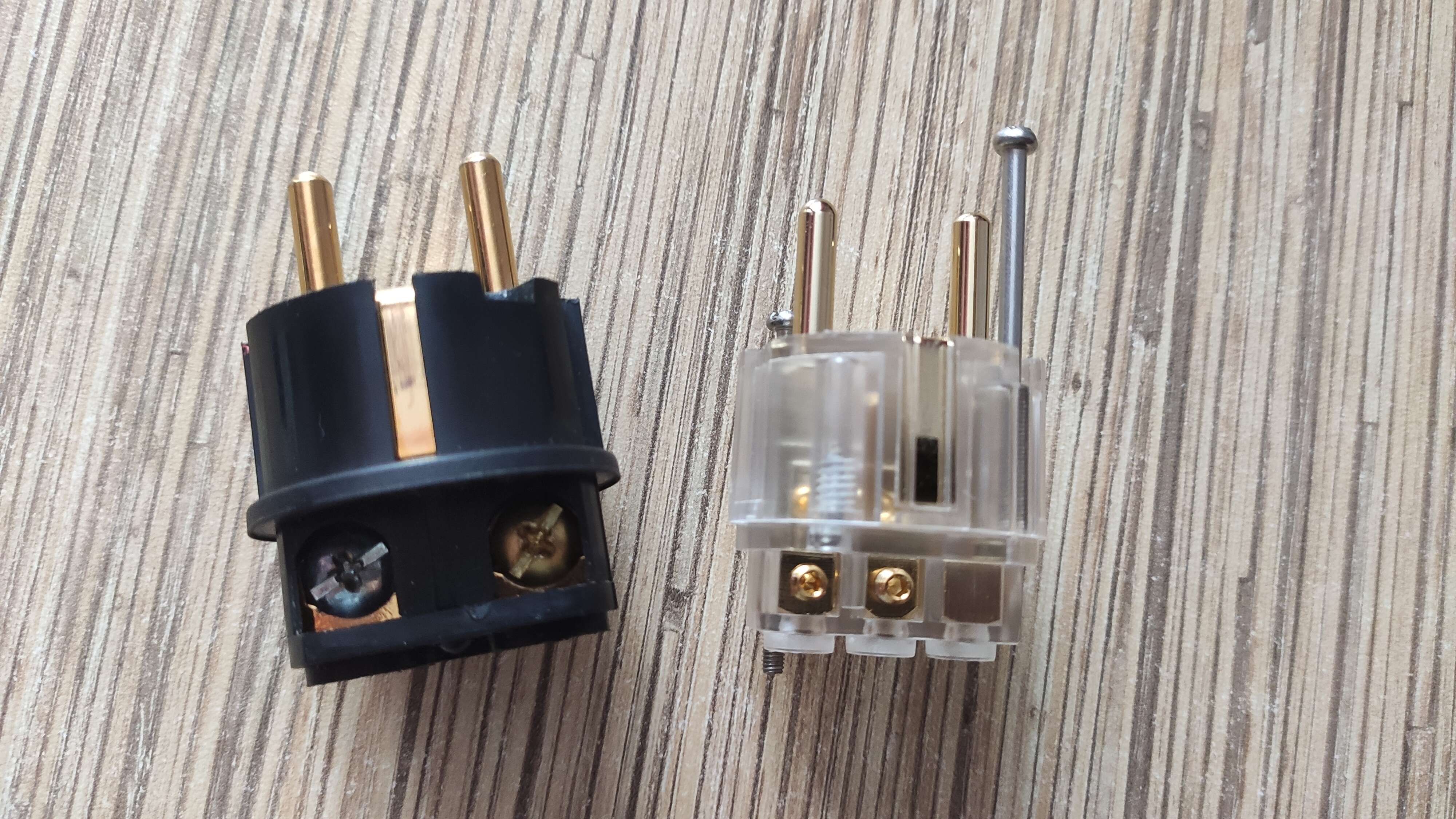 Являюсь обладателем 4х силовиков от Михаила из максимально толстой моножилы 5.2 кв., в целях экономии все брал с вилкам китайскими копиями Ойяда. Вот решил провести апгрейд, в основном проводе на ЦАП/Усь ( в данный момент пользуюсь только ушным трактом ), 2х метровый, поменял вилки на фирменные Furutech fi-38( g) и Furutech fi-28( r) , звук очень классный по сравнению с копией Ойяда, ровный, чистый, хочется закрыть глаза и мурлыкать от наслаждения…и это сразу, без прогрева.