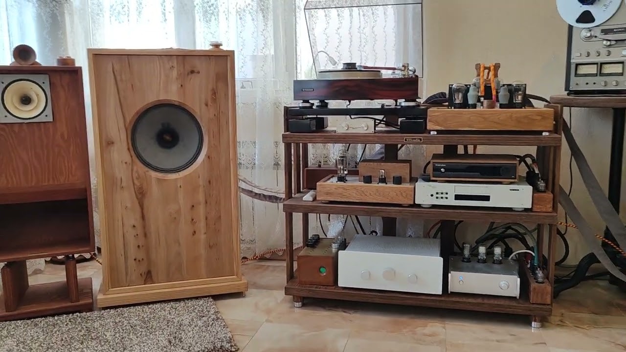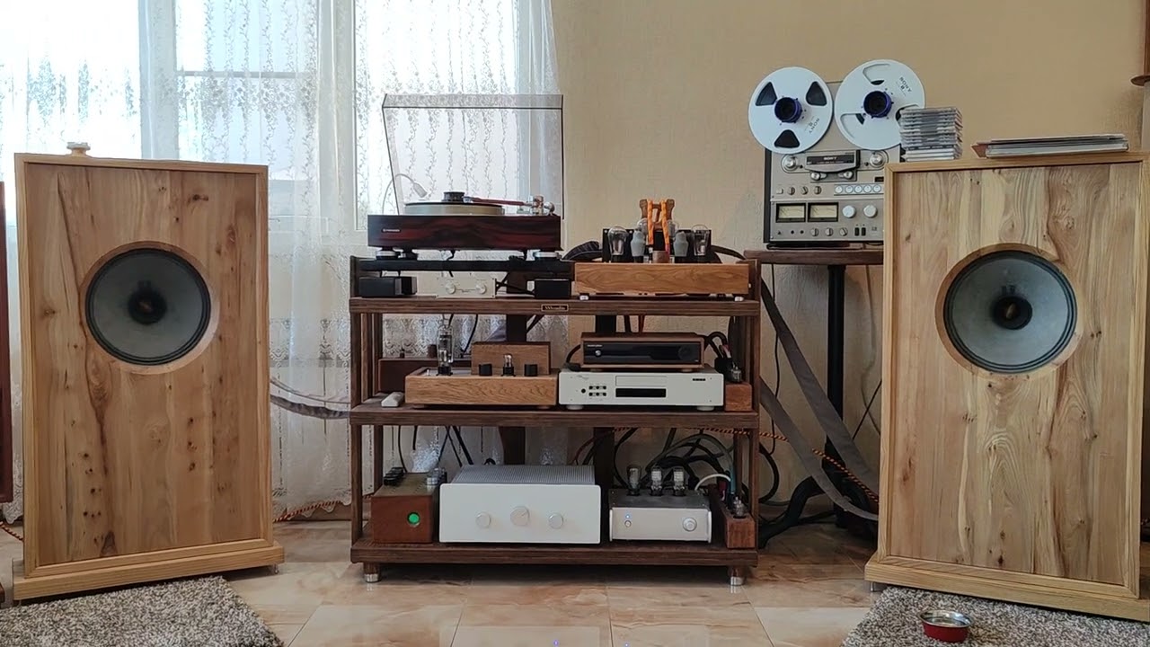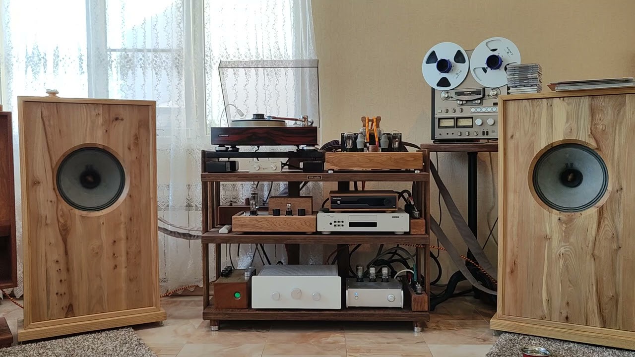 4 слоя ламинированной тридцатки, отделка палисандром. Вес где-то 20 кг. Можно, при желании, поставить три тонарма, в тч 12’’