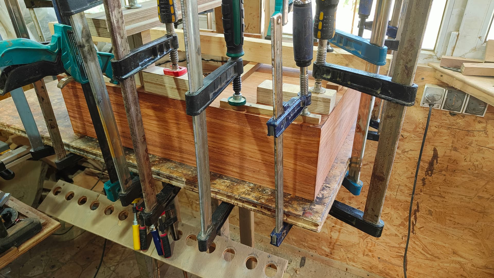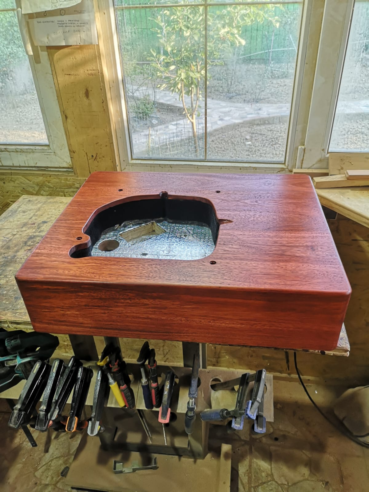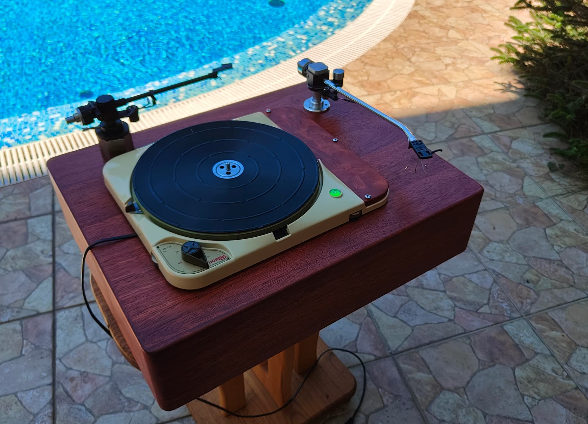 4 слоя ламинированной тридцатки, отделка палисандром. Вес где-то 20 кг. Можно, при желании, поставить три тонарма, в тч 12’’