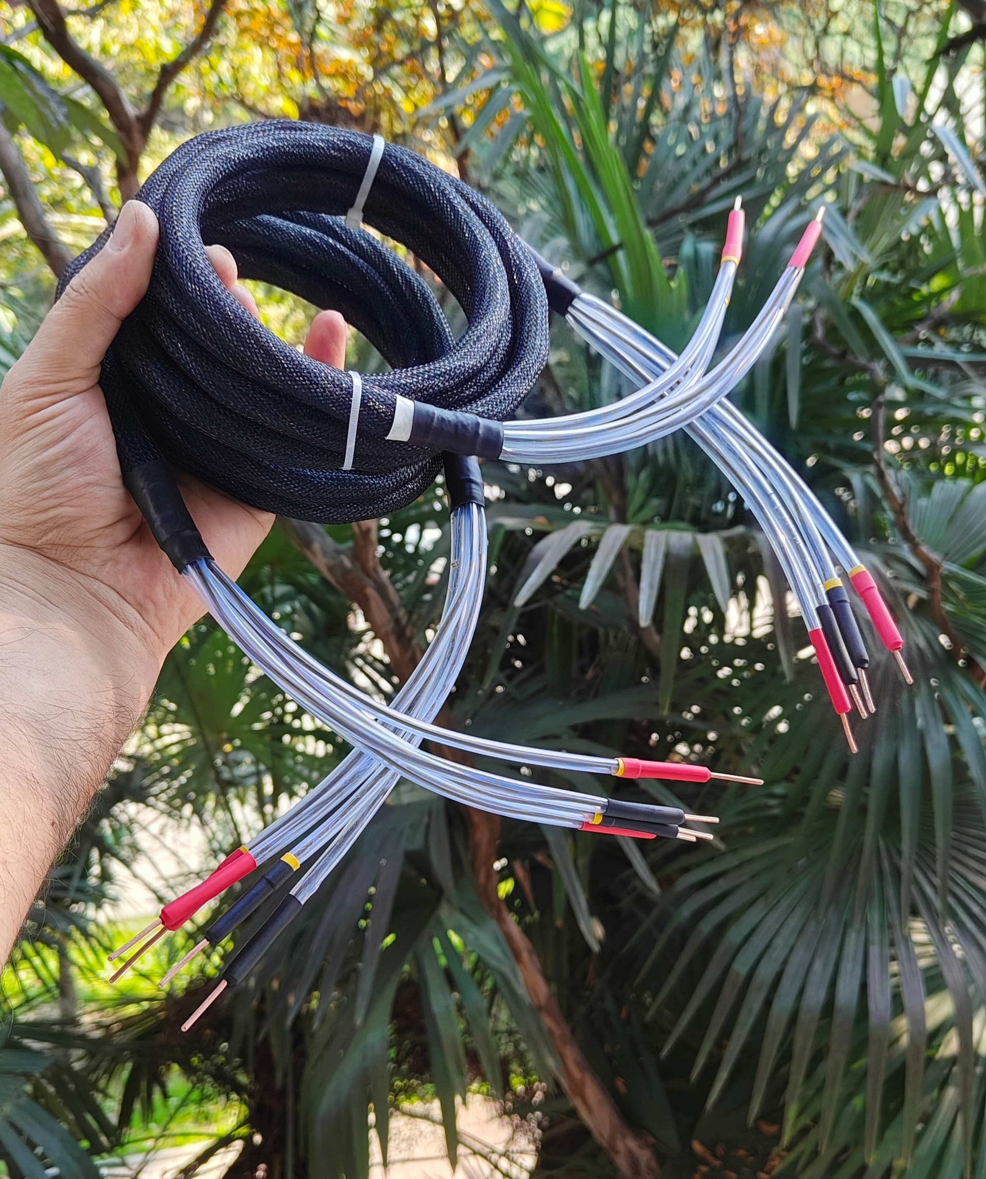 Акустическая пара на винтажной моножиле в воздушном диэлектрике, межблочная пара и коаксиал на плоской винтажной моножиле в воздухе с двойным экранированием по технологии Айконокласт, силовые кабели на винтажной моножиле в воздушной изоляции: