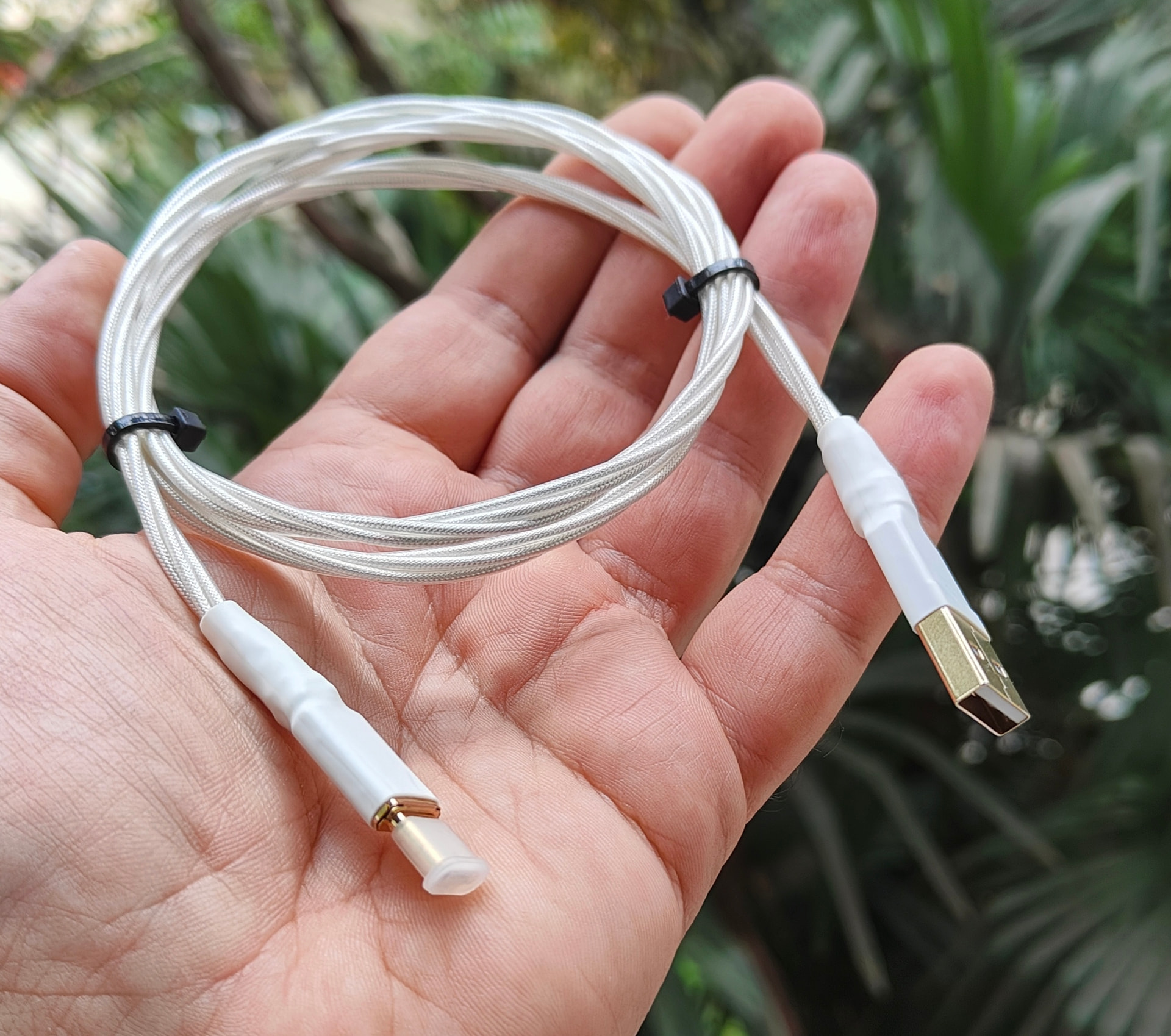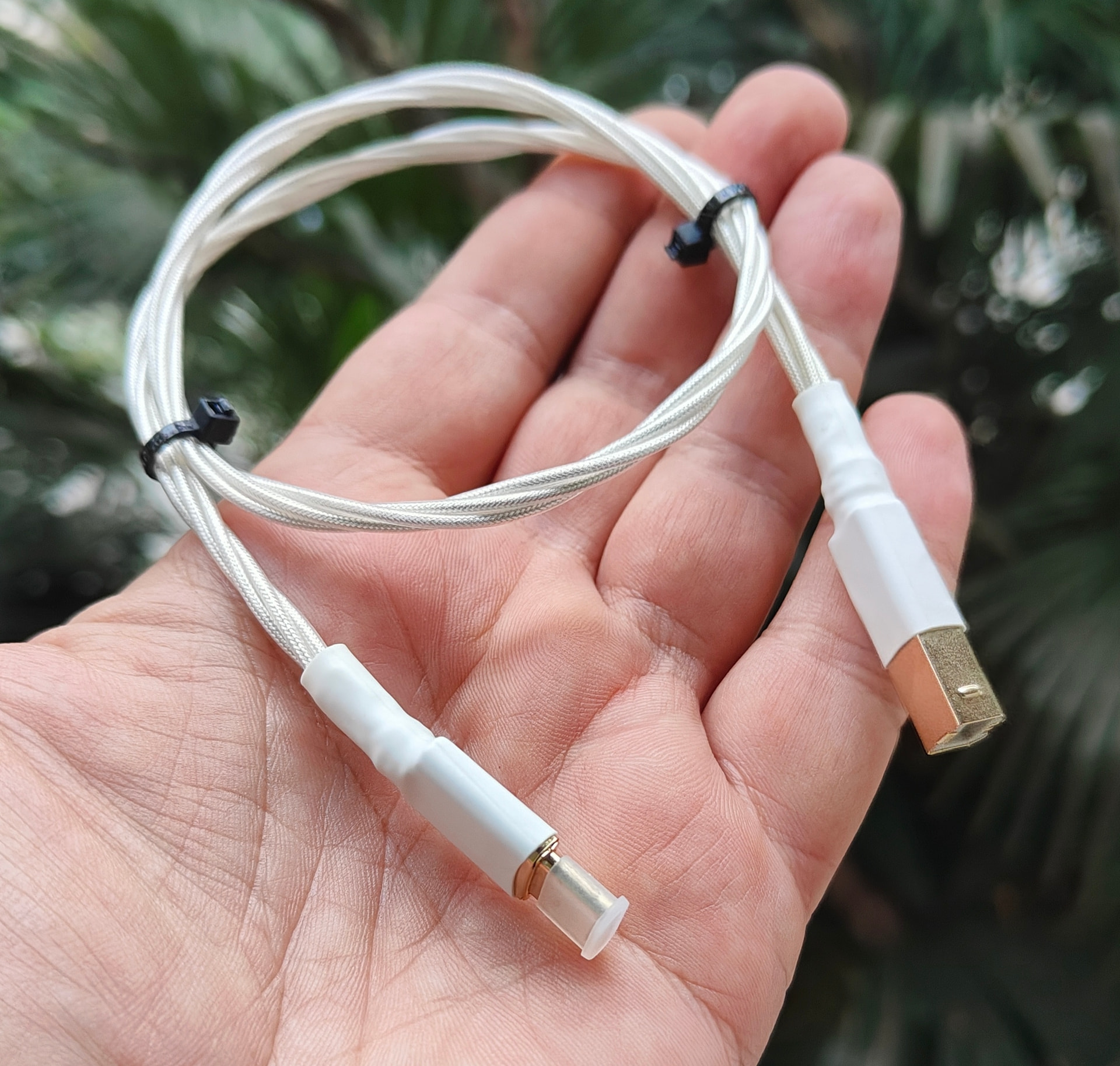 Для передачи USB-audio кабель USB-A –> USB-C на 56ком, моножила, винтаж, дискретное экранирование каждой линии, содержит серебро.