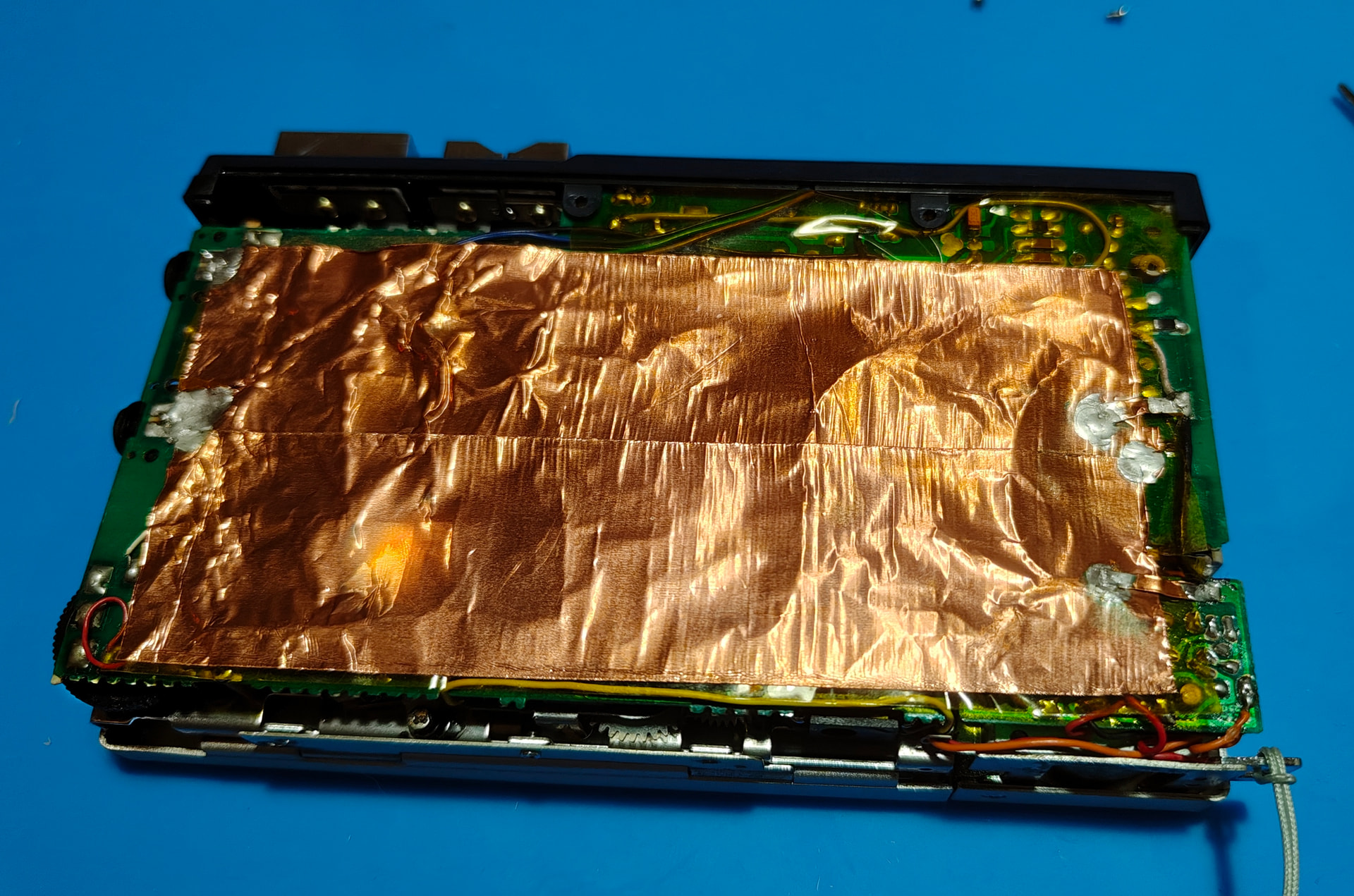 Итого, заменили все электролиты, развели землю, отполировали батарейный отсек, заменили контактные пружины, сделали ревизию по всем контактам, проверили работу усилителя, сделали медный экран. Машина ожила снова
