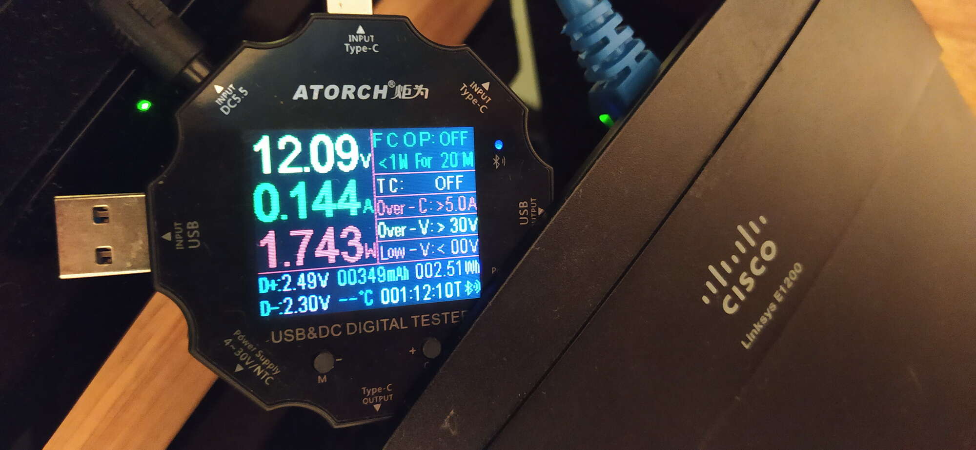 Lynksys E1200 v2 (12В/0,5А) - получается при 12В в среднем 0,144А: