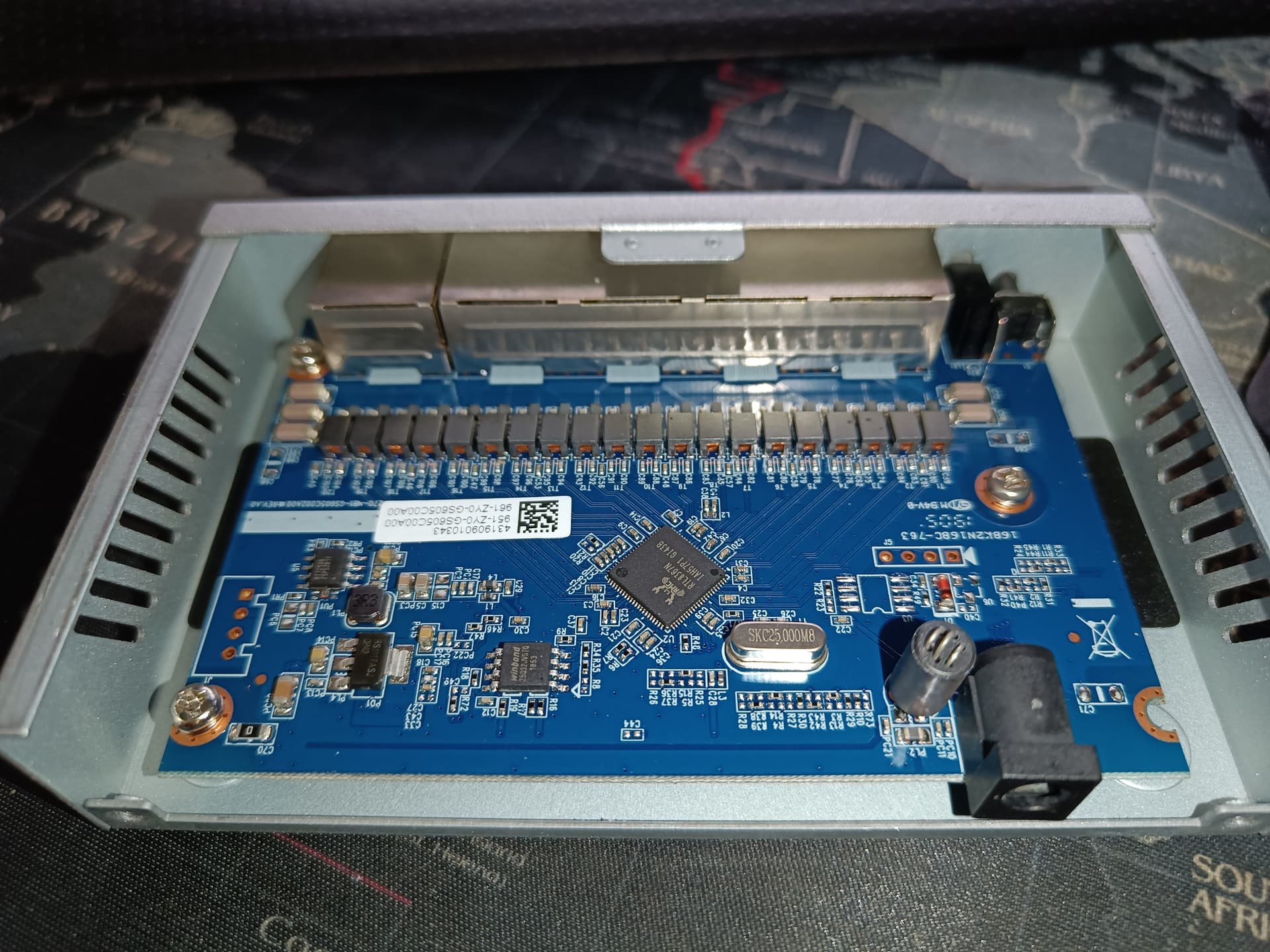 Ниже фото его потрохов. Разница с обычными свитчами, в микрухе управления от Винбонд. В остальном как и у собратьев - тот же линейный стаб RS1117ASJ-D и клок. Контроллер RTL8367. Кондеров для перепайки на удиофильские не положили.