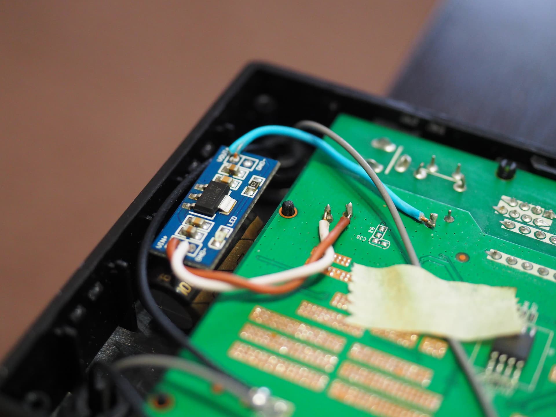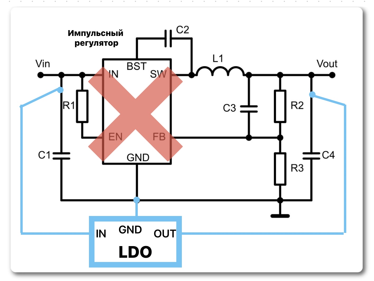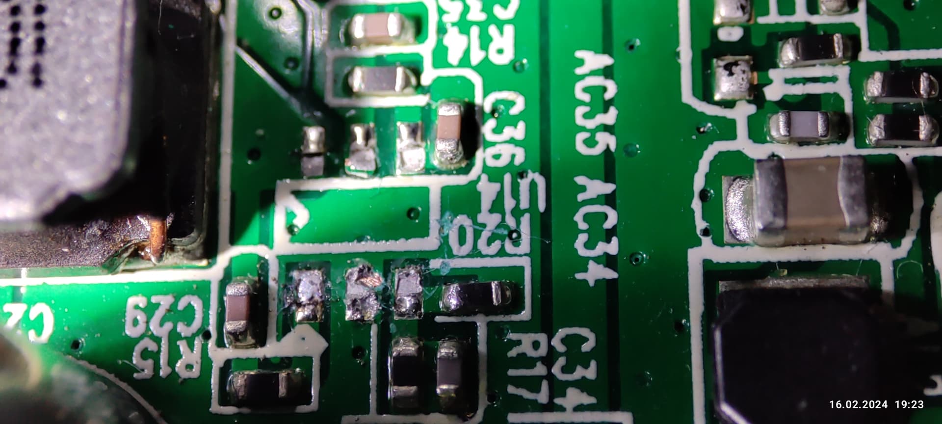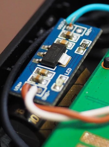 Аккуратно удалите единственный импульсный DC-DC преобразователь и припаяйте, как на фото, очень внимательно, без ошибок, новый линейный стаб!