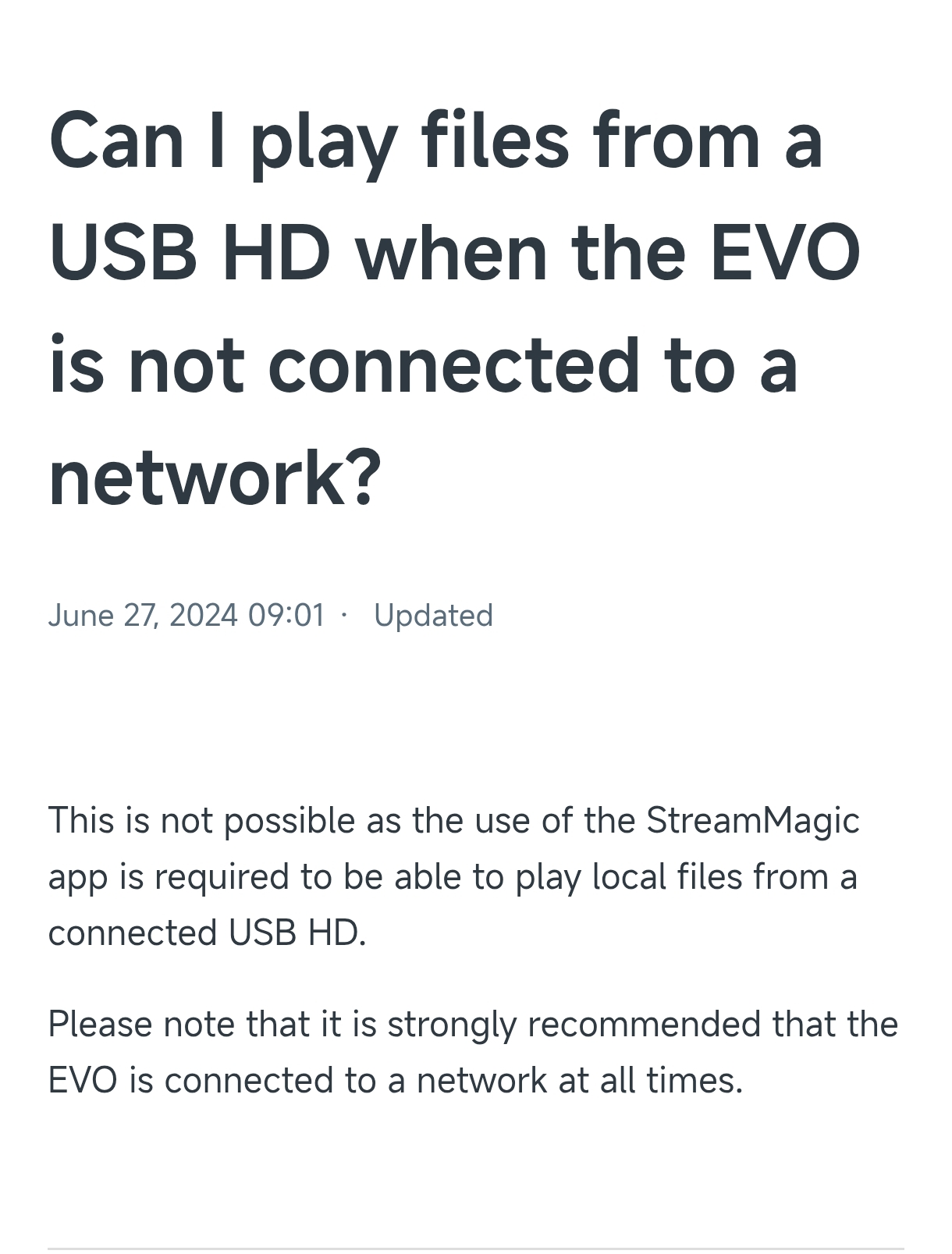 Я задавал вопрос в Аудиоманию, где приобретал Cambridge evo 150. Мне ответили, что без интернета использовать с внешнего носителя по usb не получится. Вообще, первый раз с таким сталкиваюсь. Самый первый сетевой плеер у меня был Pioneer n50, после него был Atoll st200, потом Matrix mini i4, потом Eversolo a8 и везде проигрывание с флешки было без проблем и только Cambridge неприятно удивил.