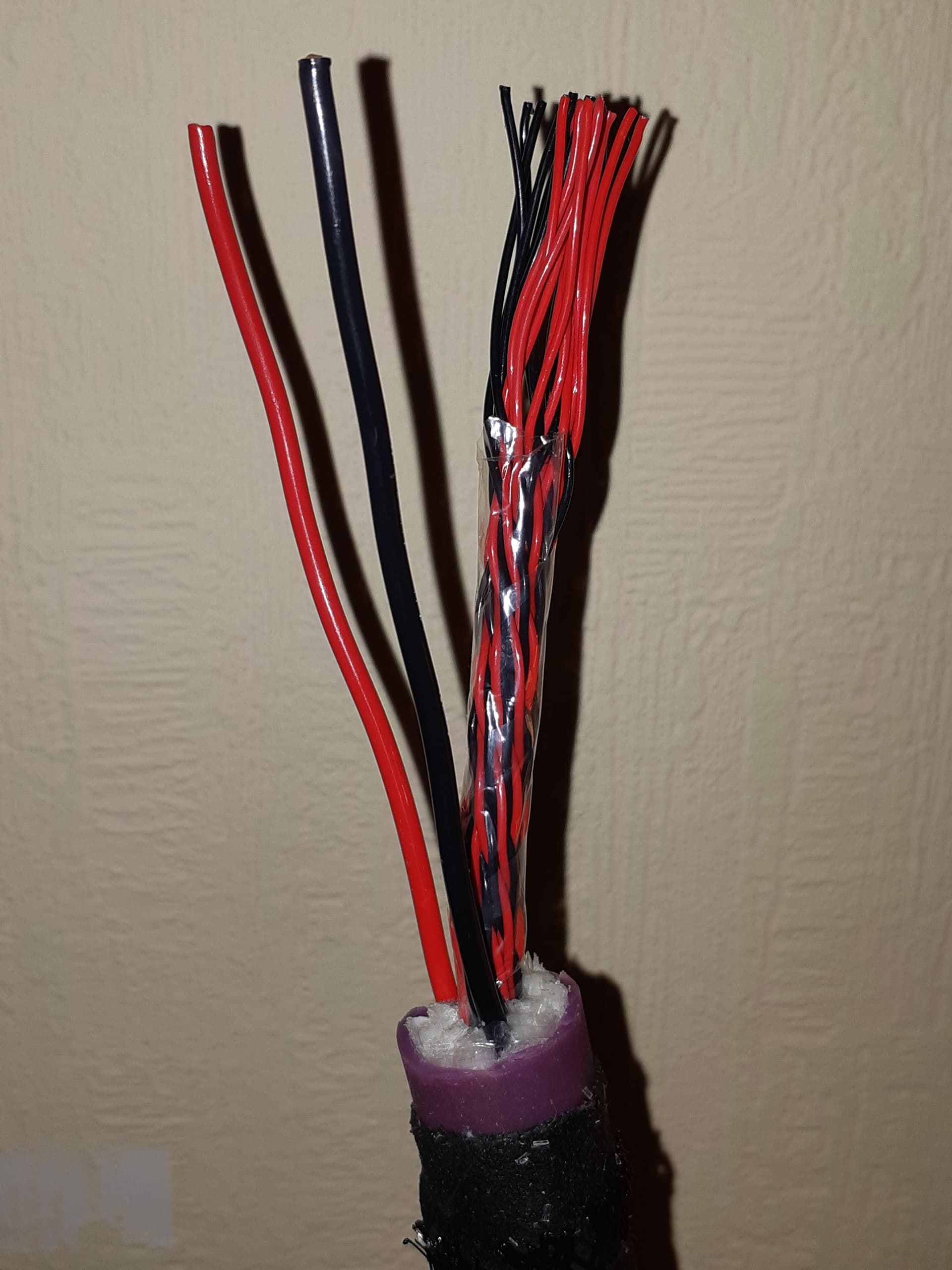 Извиняюсь за внеплановый подъем сообщения. Измерил еще раз длину кабеля с лопатками - 1,7 м. (с лопатками). Родные лопатки были толстые и узкие и очень много было припоя, распаять было не реально. Пришлось резать, с учетом структуры, кабель ОЧЕНЬ сложный в разделке.