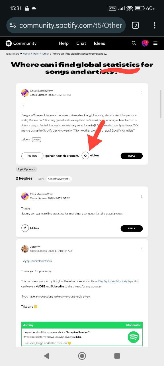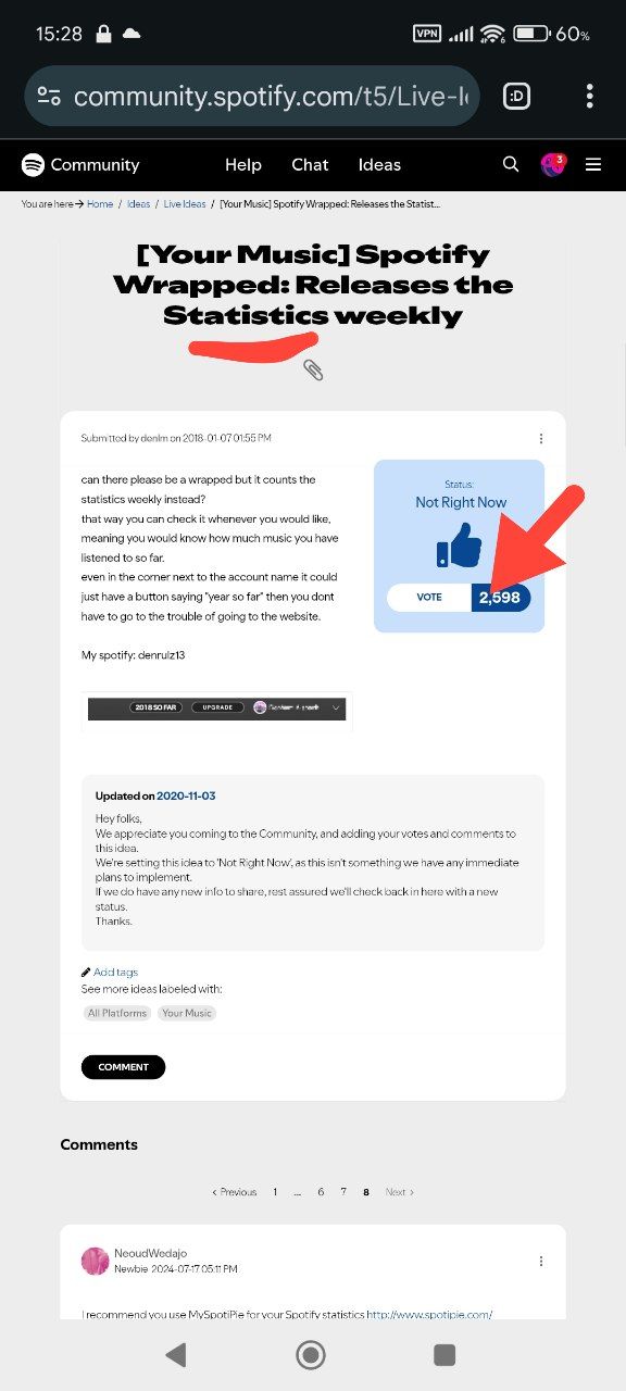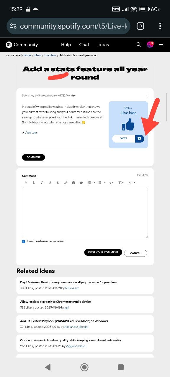 Результаты поиска запросов в разделе предложений, на форуме Spotify, по словам “stats” или “statistic”: