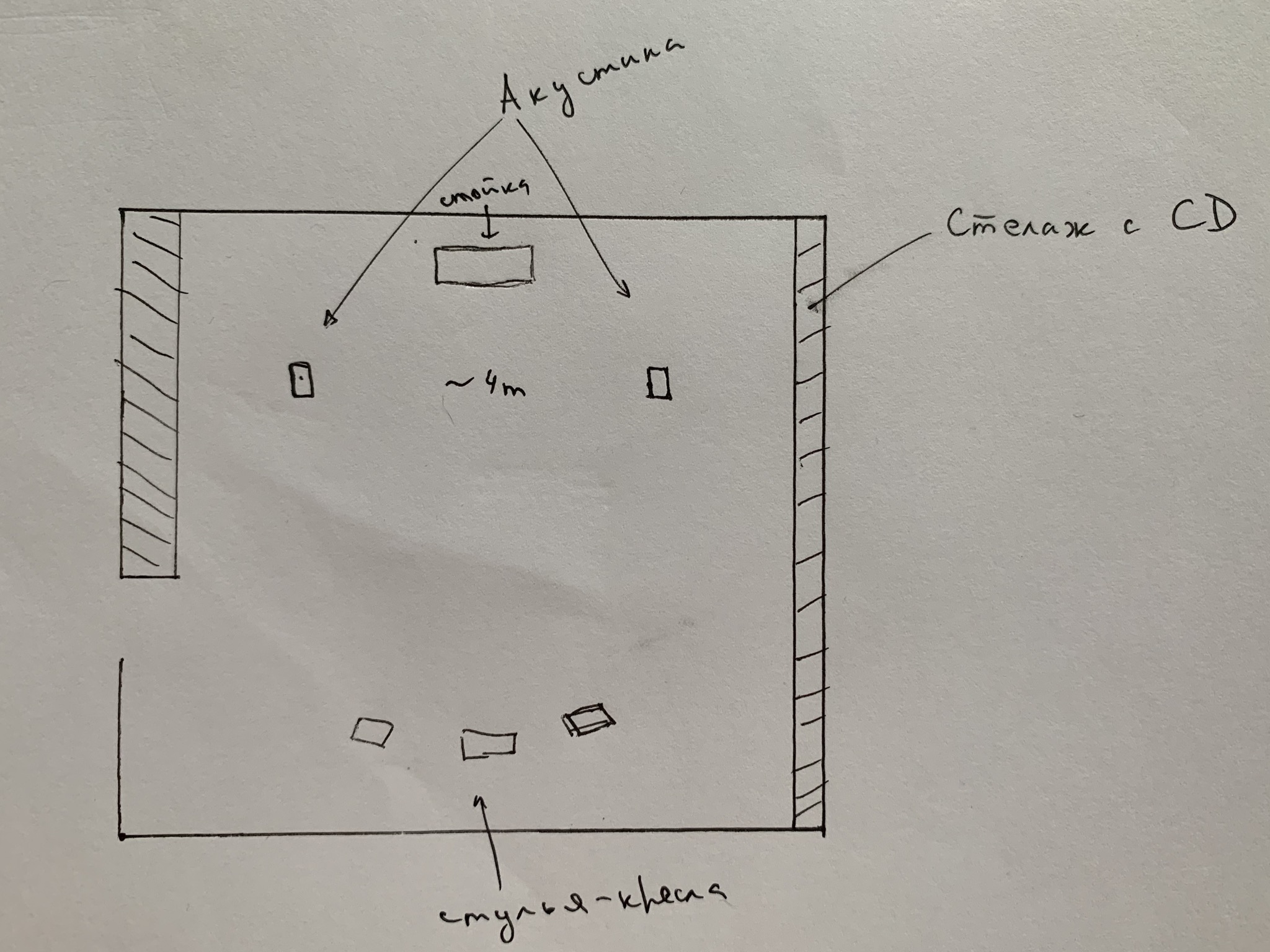 Чтобы вам было легче себе представить общую расстановку, я нарисовал схему. Тоже обратили внимание на то, как широко стоит акустика?