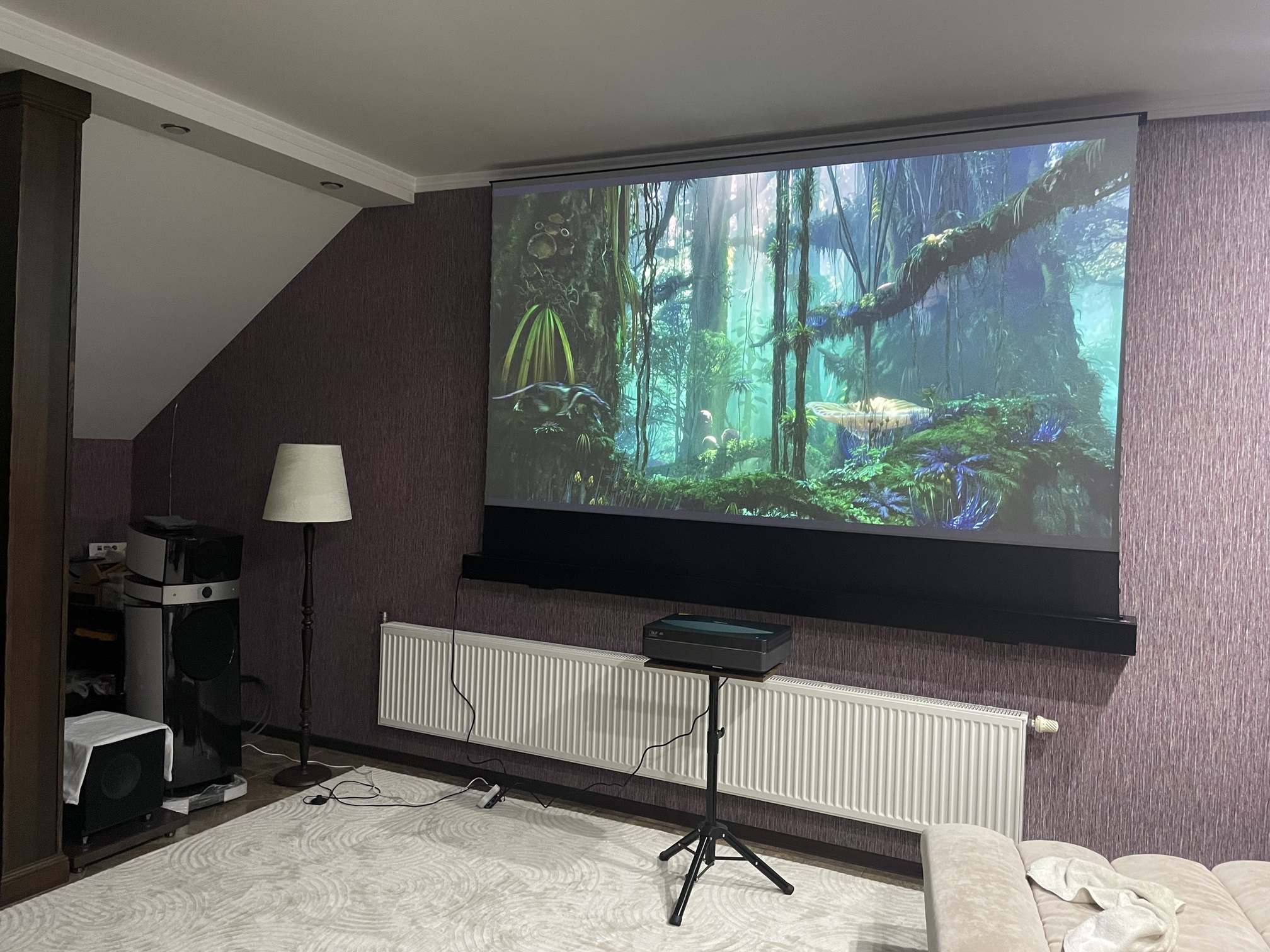 С проекторами тоже все не так просто - хотя моторизированный экран уже давно висит на потолке, но комната типа вагона и расстановка акустики по короткой стороне не приводила к какому-то законченному инсталляционному решению…