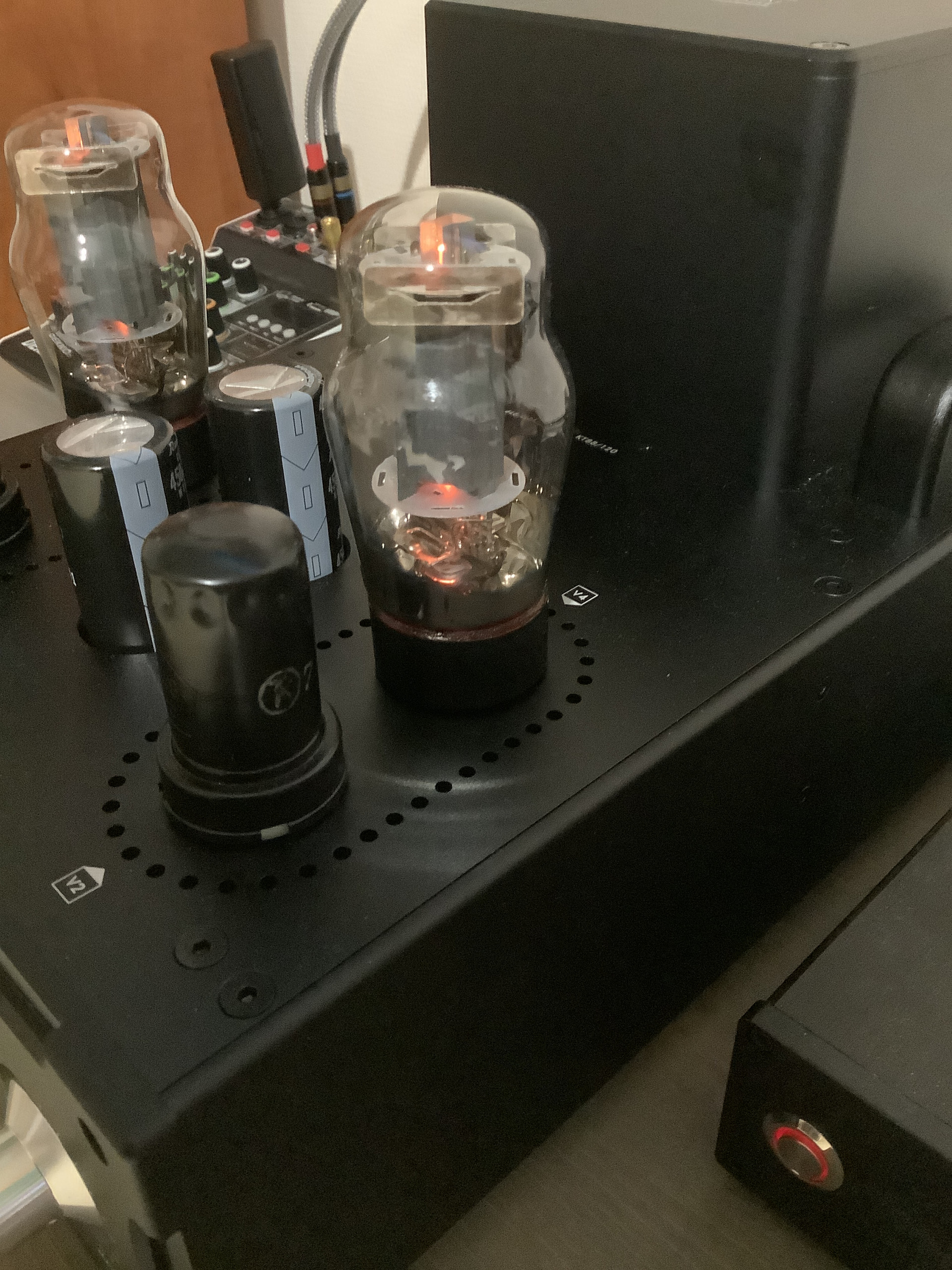 Поставил Г807, чистенько, но как-то ровно всё, не цепляет. Сегодня поставил КТ88 и переключил режим соответствующий, гонял весь день, заиграло интереснее. Но, по ощущениям, не смотря на большее количество ватт, при том же положении регулятора громкости играет потише чем МК3, не так ярко, но чище что-ли, как будто шумов меньше. Вообщем звук отличен от МК3, кто собирается менять, подумайте, если 3-ка заходит, то не факт что 4-ка для вас будет лучше. Также заметил что на КТ88 очень сильно греется силовой трансформатор, руку обжигает, в режиме 6l6 был чуть теплым, практически холодный. Гоняем дальше.
