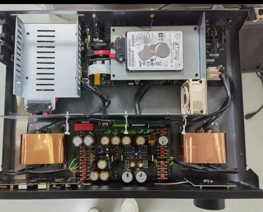 Применен цап ESS9038PRO выглядит внутри фото не мое.Аппарат весит 8кг в питании два R- Core трансформатора,отсек для 3.5/2.5 HDD до 16ТВ, Roon Ready.Встроенный генератор тест сигналов:L,R,Stereo,White noise,Sweep frequency signal.