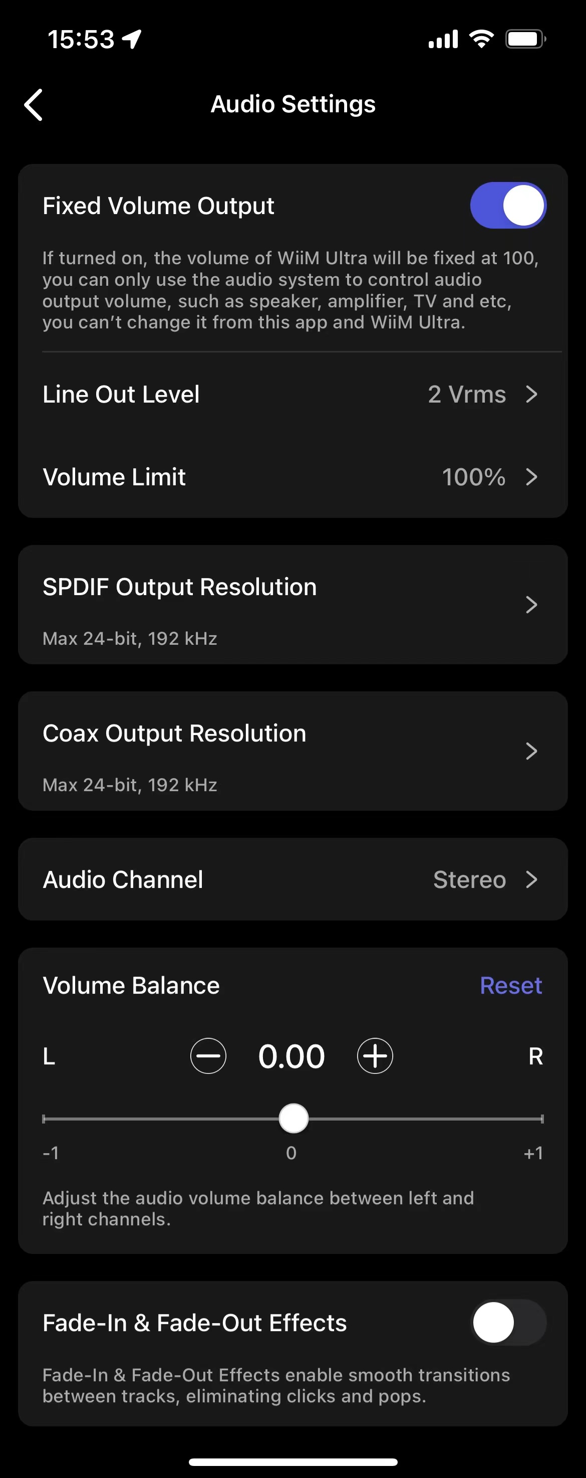 Отключить эквалайзер (если он включён). Для этого в приложении WiiM Home нужно перейти на вкладку «Устройства», нажать на значок «Настройки устройства» и выбрать EQ, затем отключить настройку.