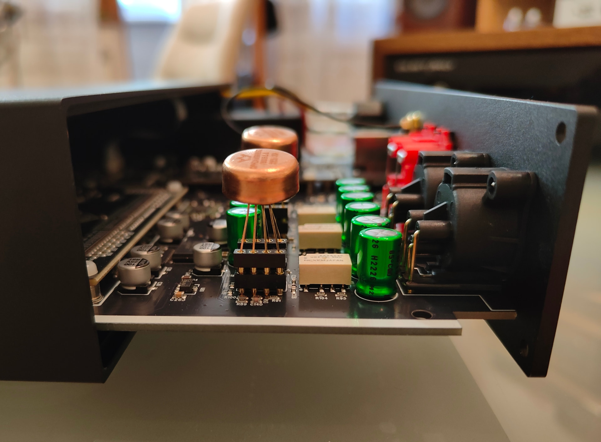 Легкий доступ внутрь для роллинга операционных усилителей: открутить 4 болта по углам задней стенки и два болта снизу на корпусе, аккуратно выдвинуть плату на треть из корпуса (там внутри шлейф дисплея и линия заземления на питании, не надо пытаться выдвигать до конца).