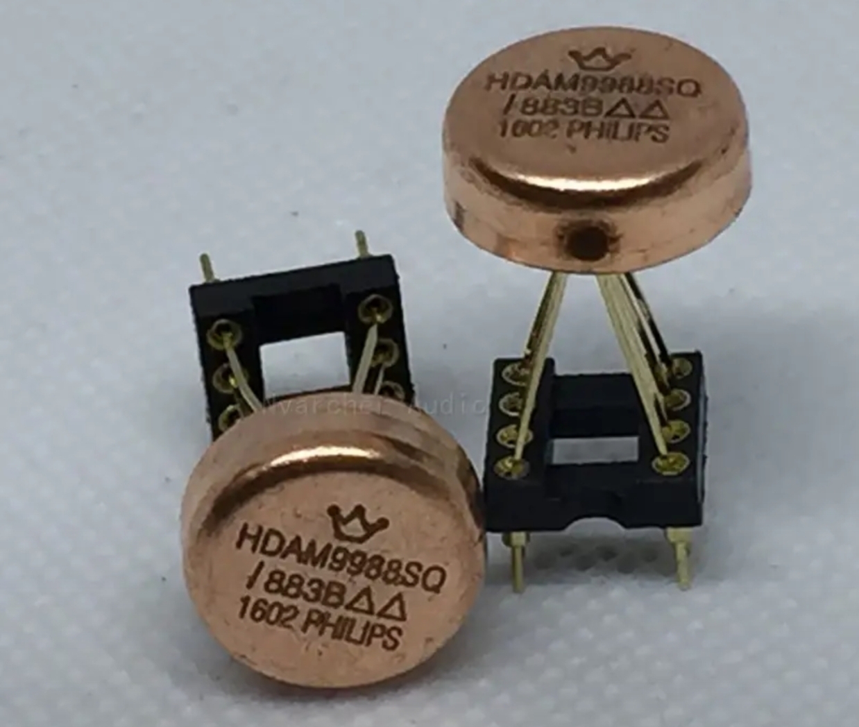 Достать штатные ОУ из кроваток. Установить новые. Полярность надо соблюсти. У кроватки есть полукруглая выемка - там пин 1, соответственно вставляем ОУ. Если ОУ куплен в кроватке, то совмещаем выемки. Если без кроватки, то на корпусе будет выбита точка, символизирующая пин 1. На фото видна набитая точка на штатном ОУ: