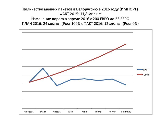 В реальности - официальный, облагаемый налогами поток, идущий через таможню и “белых” операторов (включая БелПочту) упали вдвое (начиная с апреля - на графике видите точку падения), себестоимость таможенных операций выросла в три раза (не считая облав, охот и карательных экспедиций за теми нелегальными белорусскими партизанами, которые продолжают везти посылки в Белоруссию тоннами).