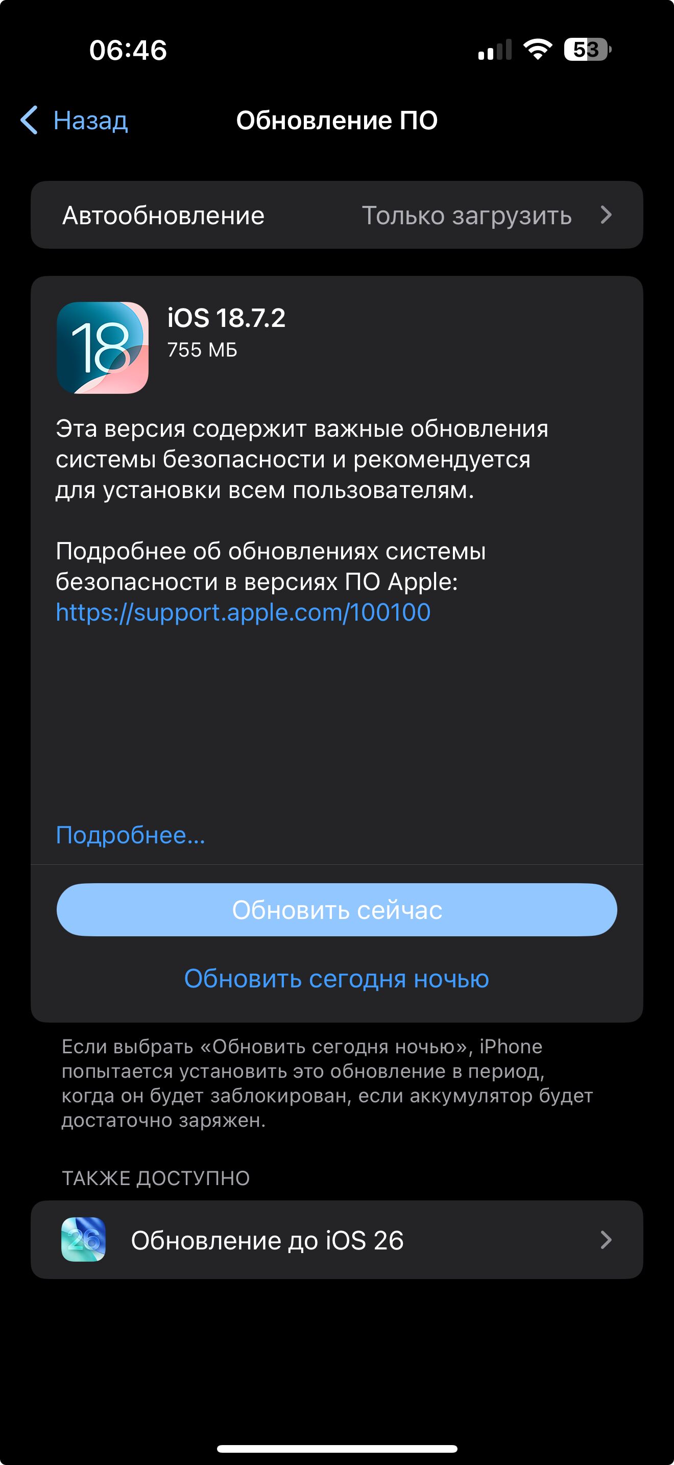 Iphone 12 ProMax - обновлял до 26.1 в режиме обновления с полной прошивкой через DFU с трепетом. Но все получилось хорошо. Интерфейс плавный и отзывчивый. Весь банковский и другой софт и вшитые e-sim сохранились и даже не пришлось авторизовываться заново. Не знаю насчет батареи, но у меня ресурс 96% и надеюсь будет нормально. Хотя хочу обновить модель из за зуда