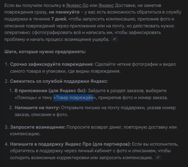 Написал в support Яндекса в разделе помощь по заказу - Товар поврежден. Вроде как в течение 7 дней можно запросить компенсацию в таком случае.