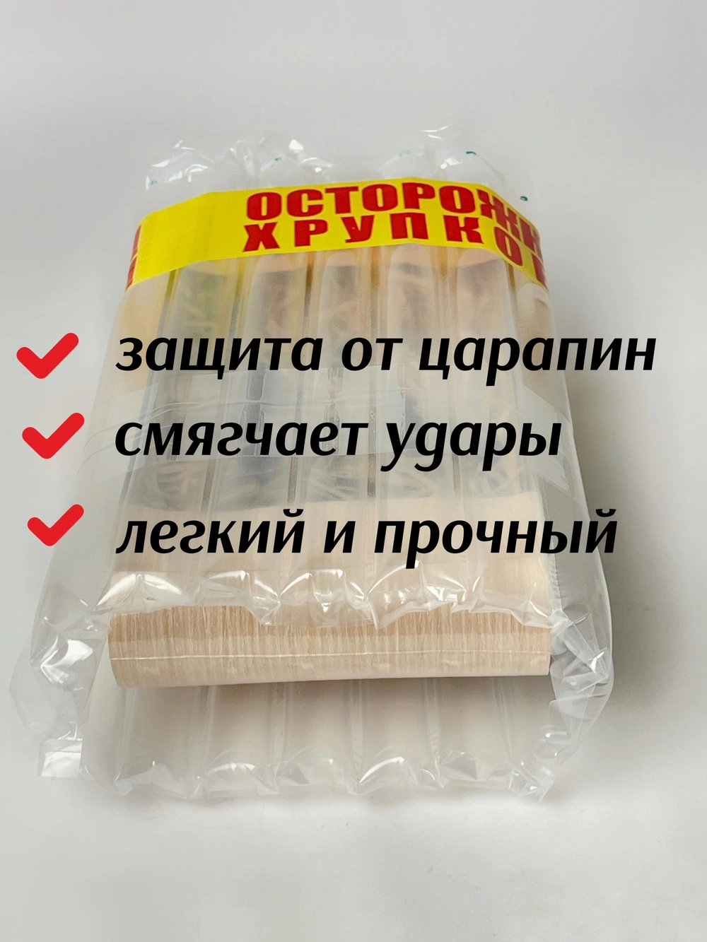 Таким образом намоткой легко регулируется набор нужной толщины до стенок коробки. Внешне это выглядит в виде объемной подушки и плотно вкладывается, в укрепленную изнутри листами картона по сторонам, коробку. Получается рекордная амортизация засчёт множества воздушных пузырьков с хорошей толщиной слоя в 8-10 см. Пенопласт всё же такой мягкости никак не дает, требует резку/подгонку, крошится.