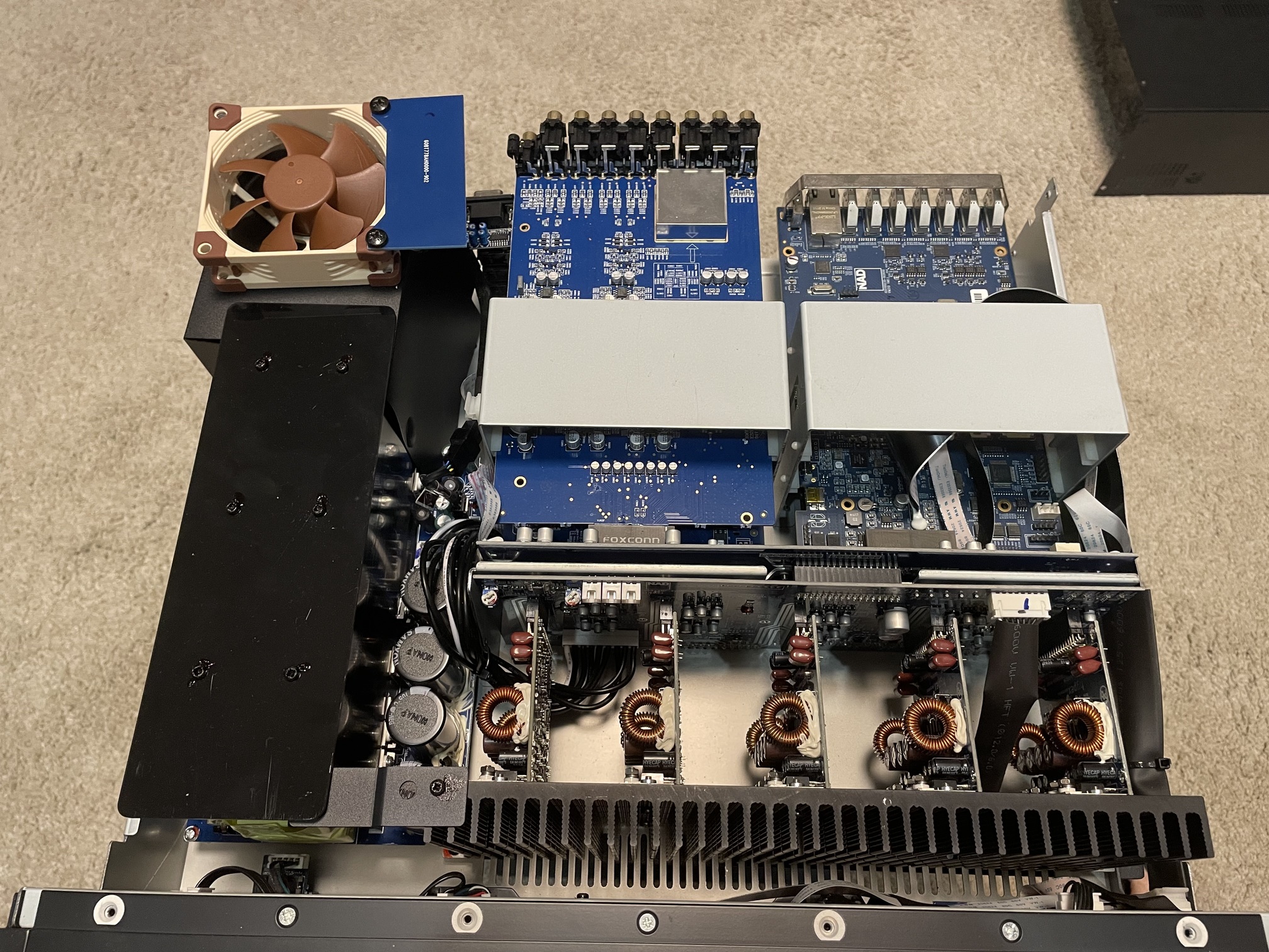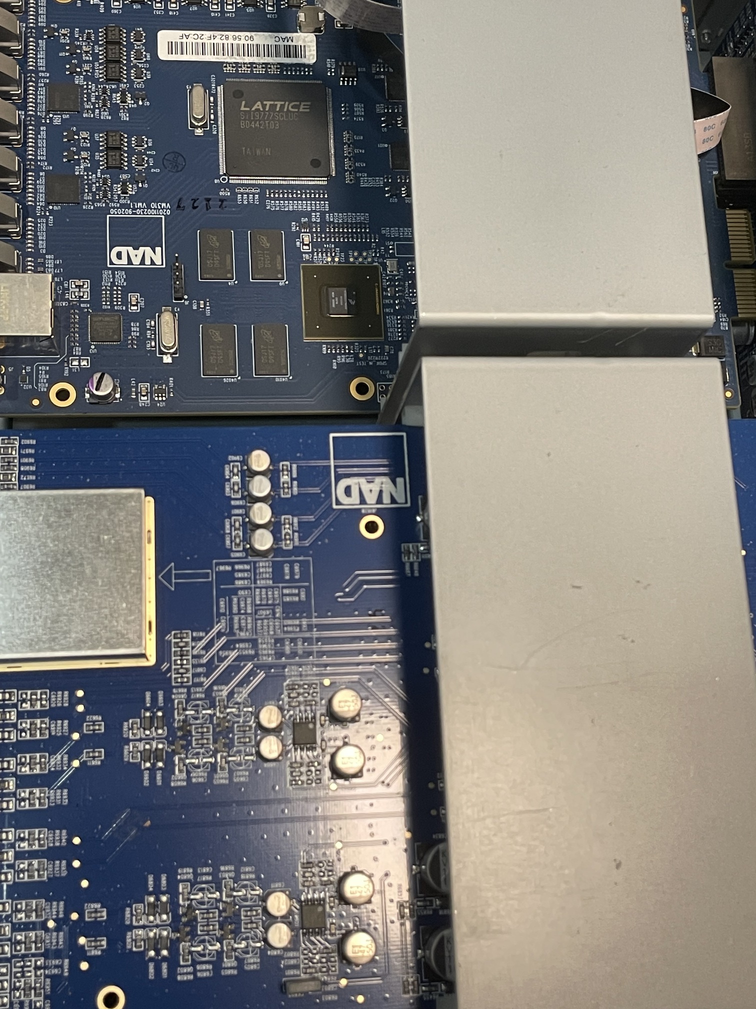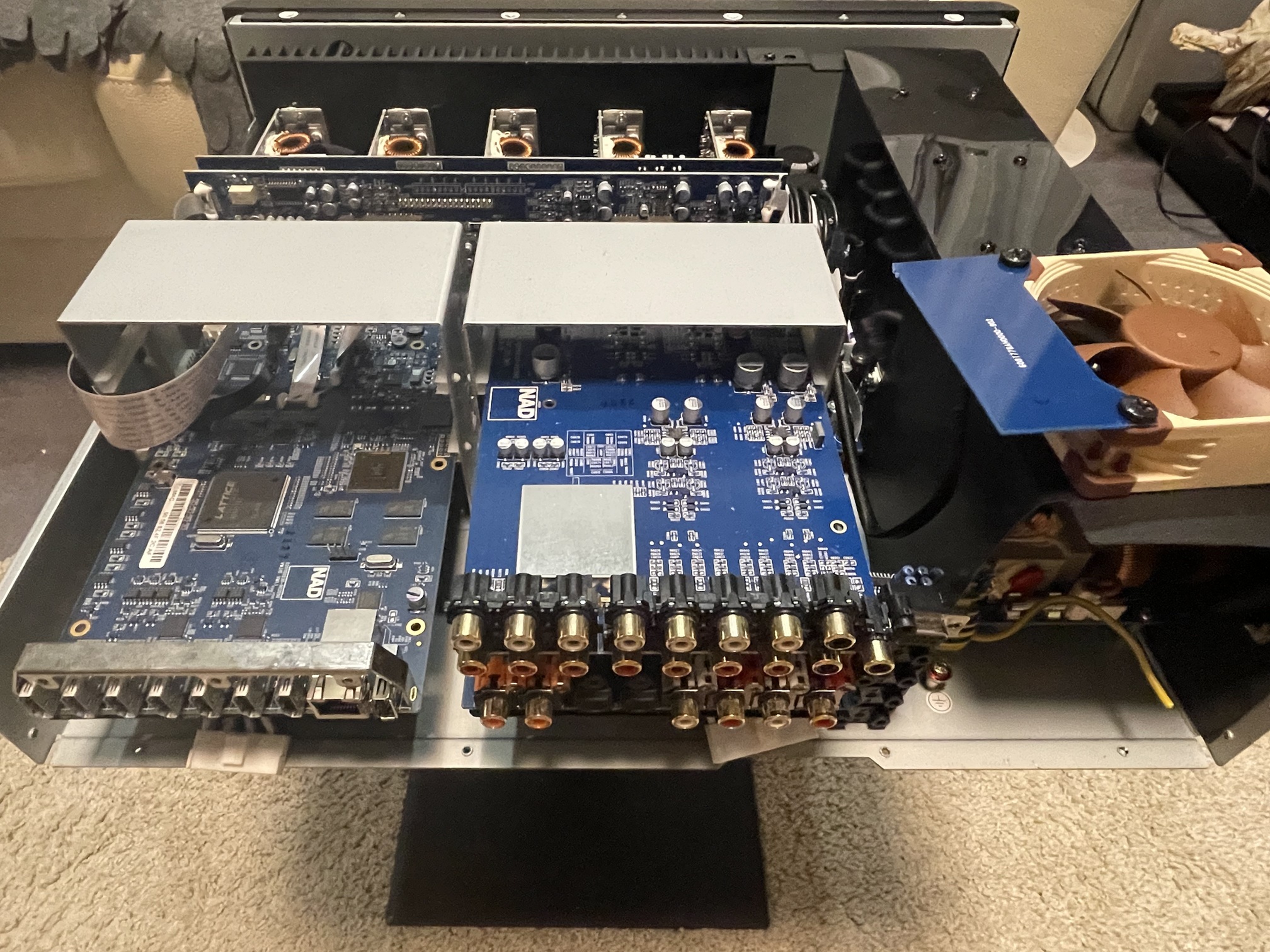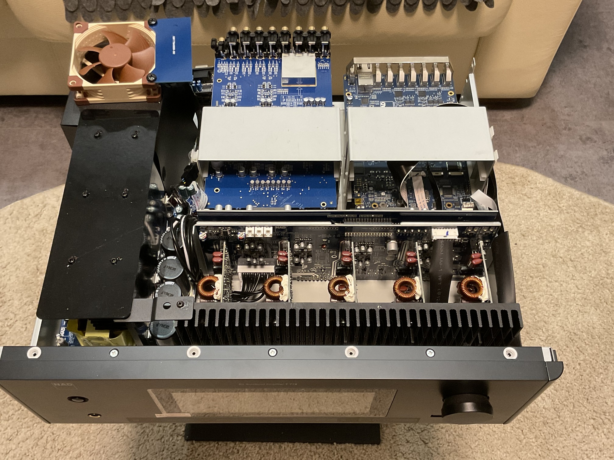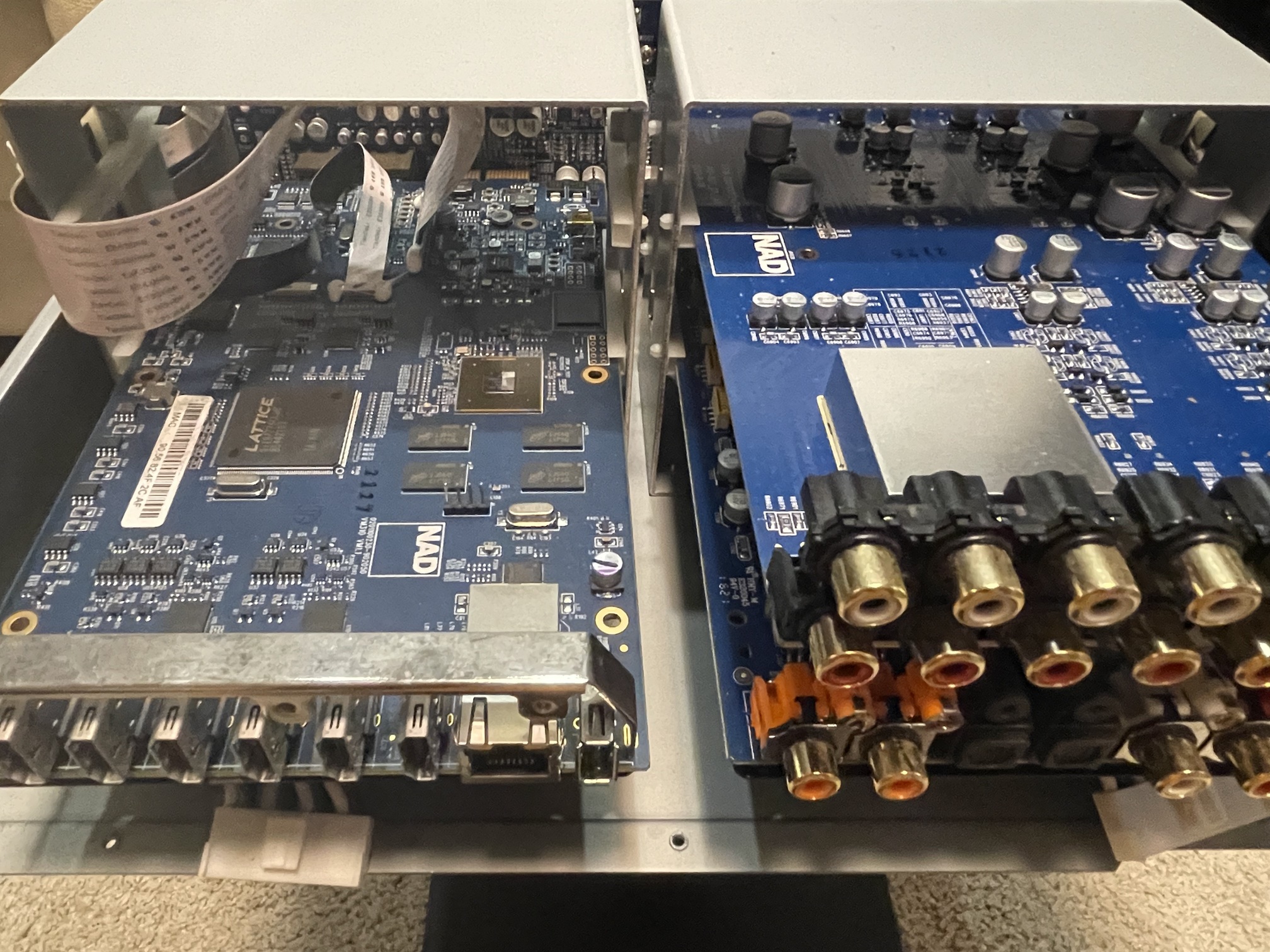 Если кому интересно, нутро AV ресивера NAD T778. Сегодня мастер был, заменил инлет. Штатный инлет, конечно, полное фуфло. Ни один приличный кабель не держался. Некоторые просто вываливались.